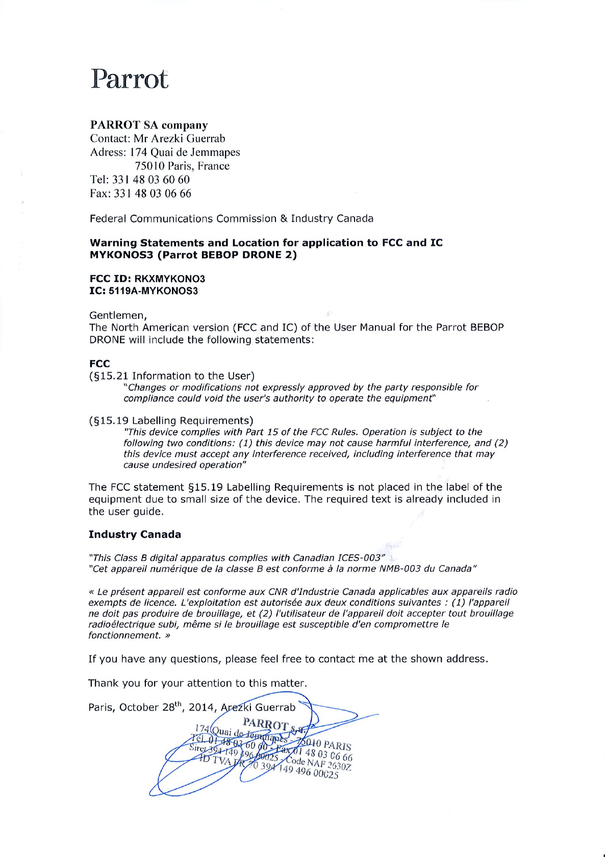 PARROT MYKONOS3 WIRELESS Quadricopter User Manual statements