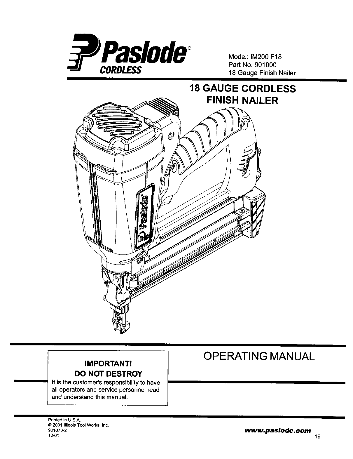 IM200F-18 IM200F-18 PASLODE CORDLESS FINISH NAILER - Manuals and Guides L0410029 View the owners manual for your PASLODE CORDLESS FINISH NAILER #IM200F18. Home:Tool Parts:Paslode Parts:Paslode CORDLESS FINISH NAILER Manual