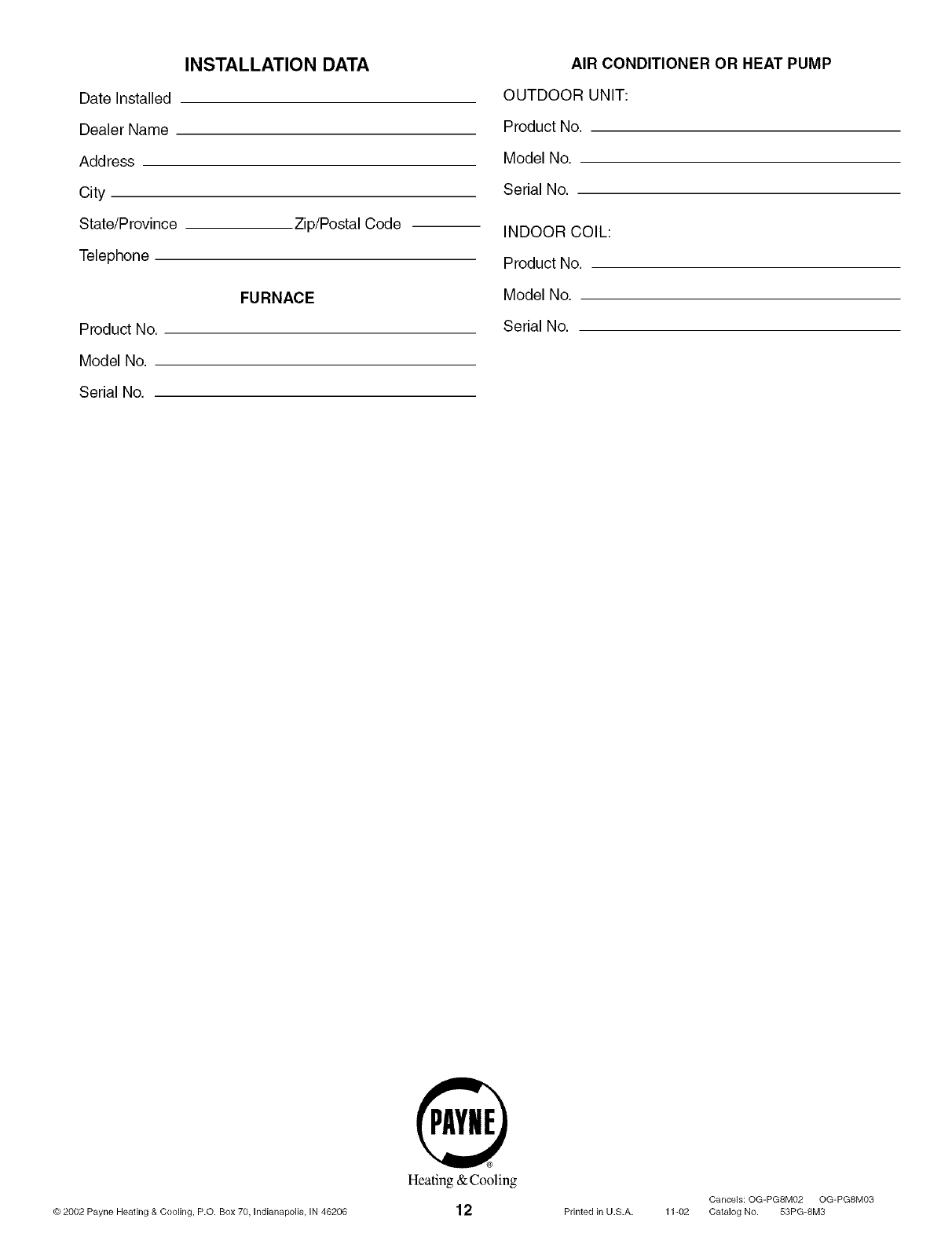 ¢c32002 Payne Heating & Cooling, P.O. Box 70, Indianapolis, IN 46206 12 Printed in U.S.A. 11-02 Catalog No. 53PG-6M3