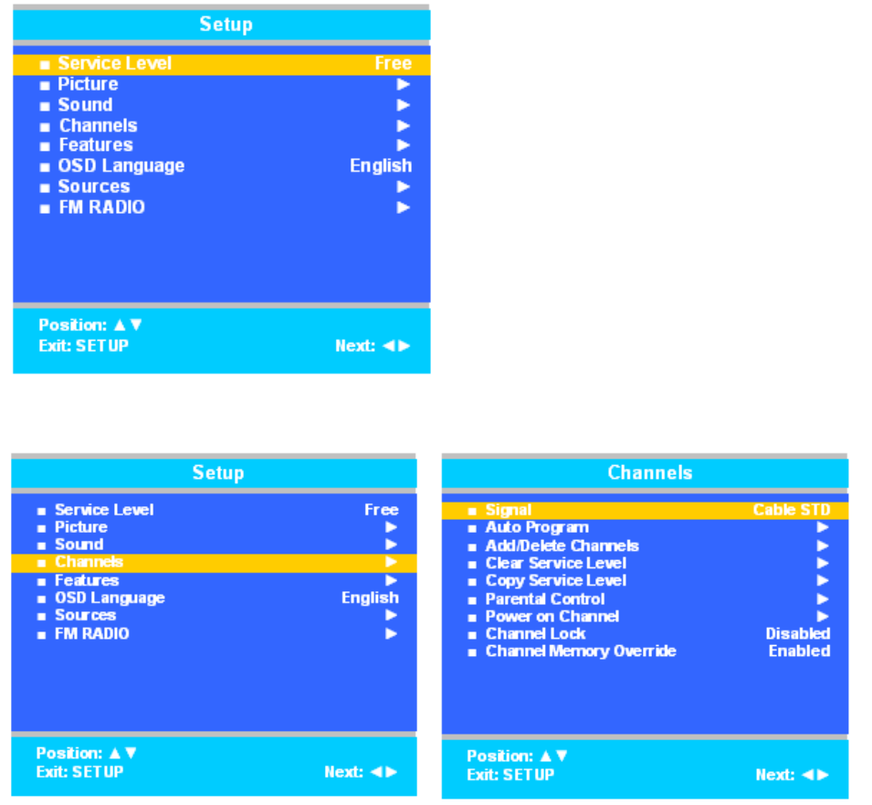 7. Press CH▲ or CH▼ to highlight the Service Level (Free, Basic, or Premium) you wish to program. The menu