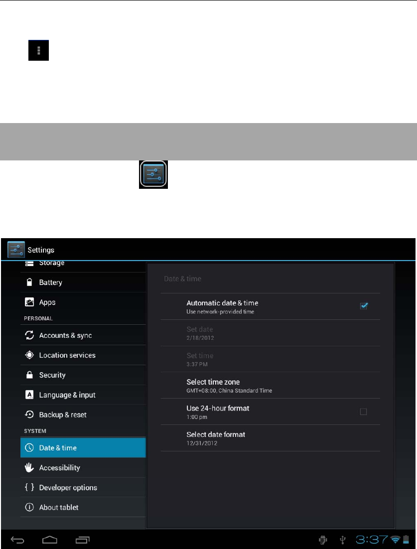 Battery, Accounts &sync, security, language, date&time, about tablet,