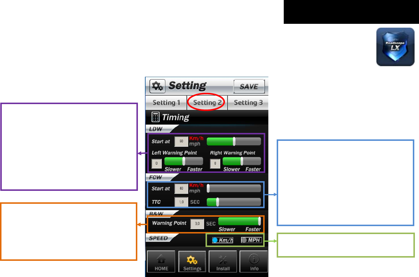 ▶According to the design of Roadscope LX, if the road is narrow, the warning sound comes