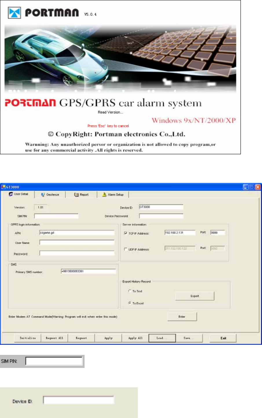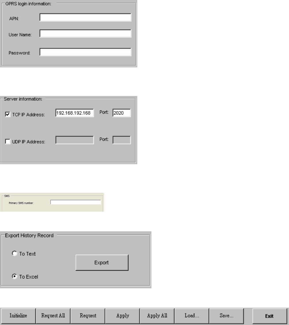 Note that the device ID, GPRS APN name, GPRS login name and password need to be set in initial PC setup in