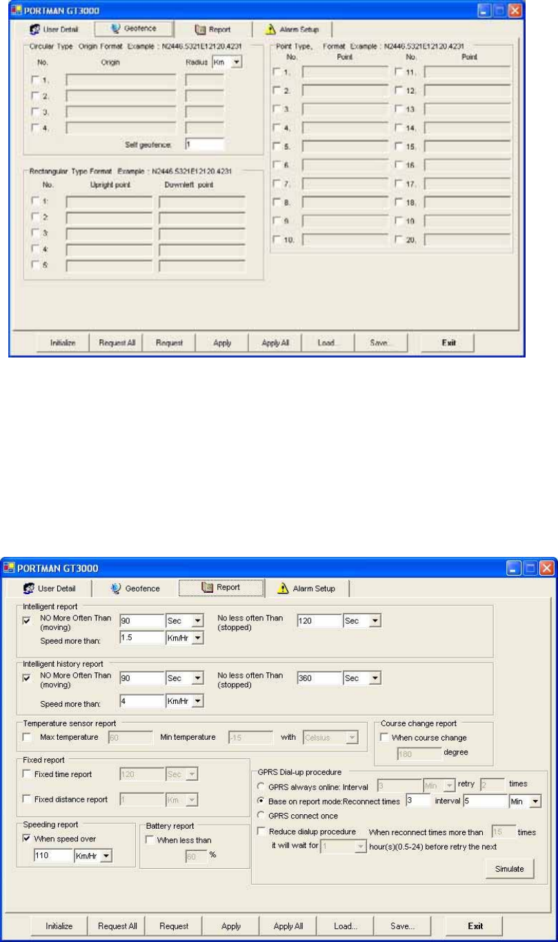 rectangular and 20 point Geo-fence shapes can be set in the device) (3) Report setting (Time, Distance,
