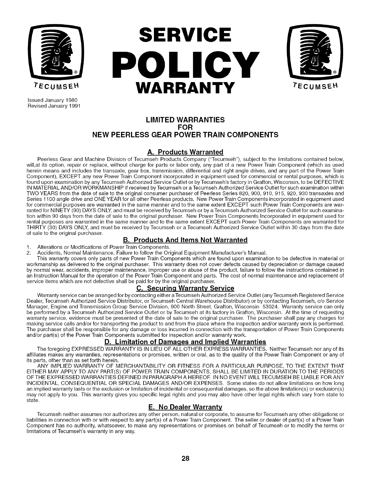 TWO YEARS from the date of sale to the original consumer purchaser of Peerless Series 820, 900, 910, 915, 920, 930 transaxles and