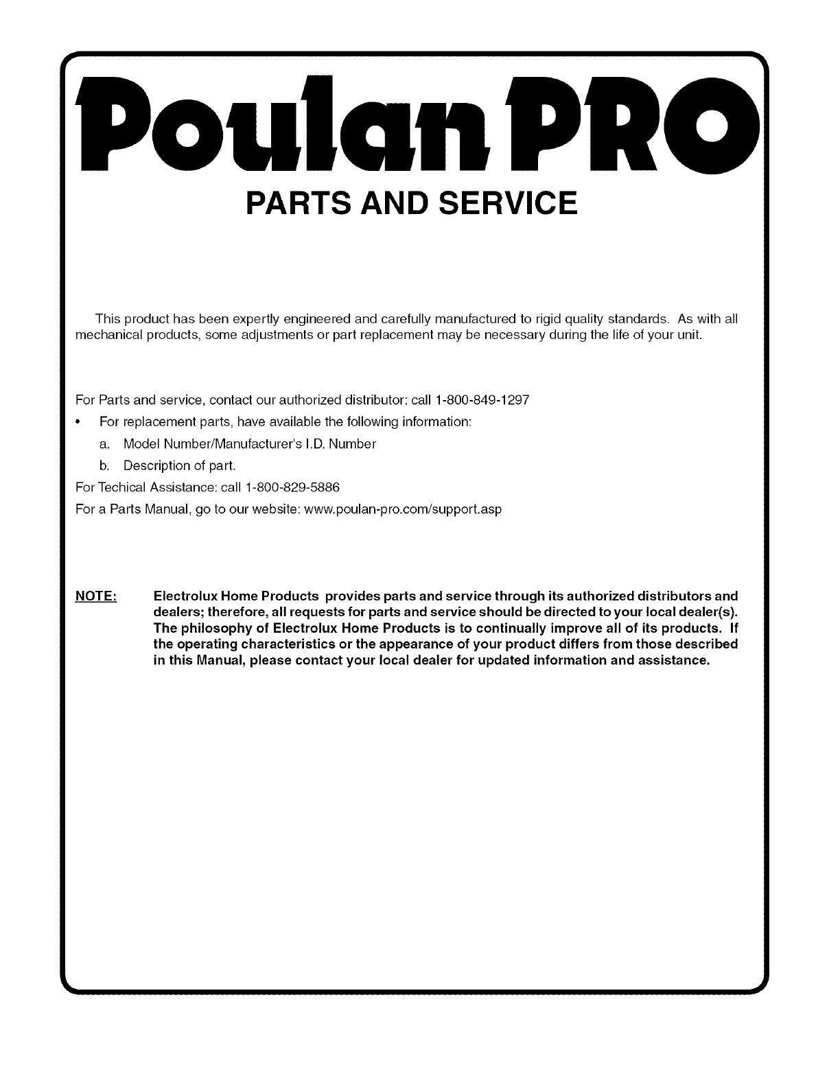 NOTE: Electrolux Home Products provides parts and service through its authorized distributors and