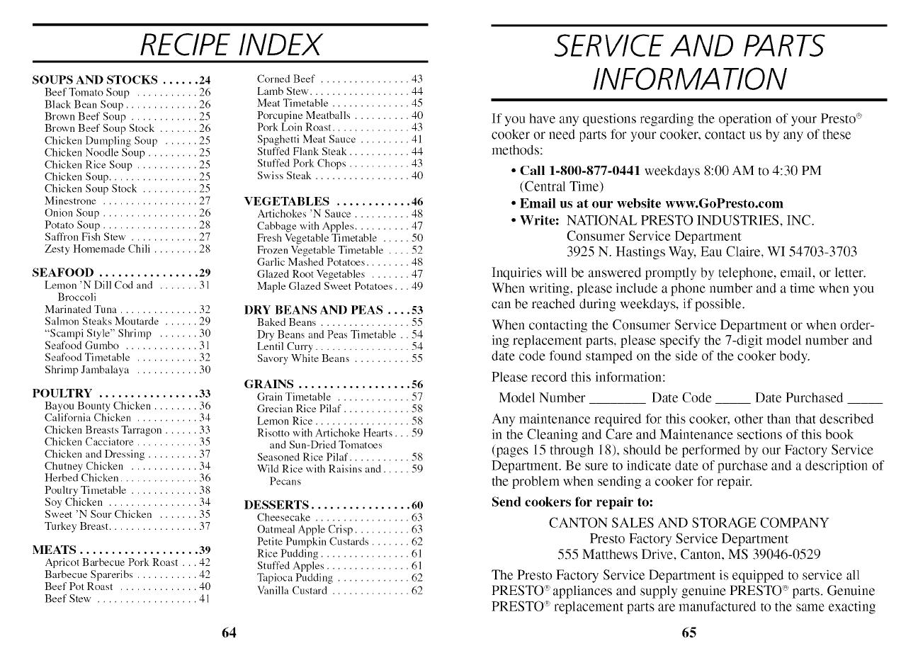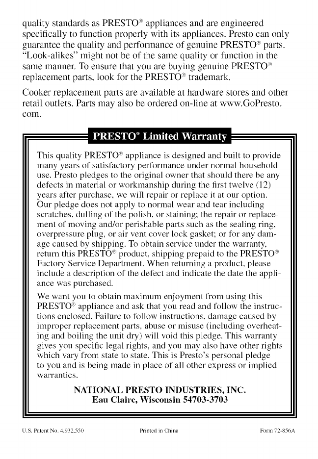 retail outlets. Parts may also be ordered on-line at www.GoPresto.