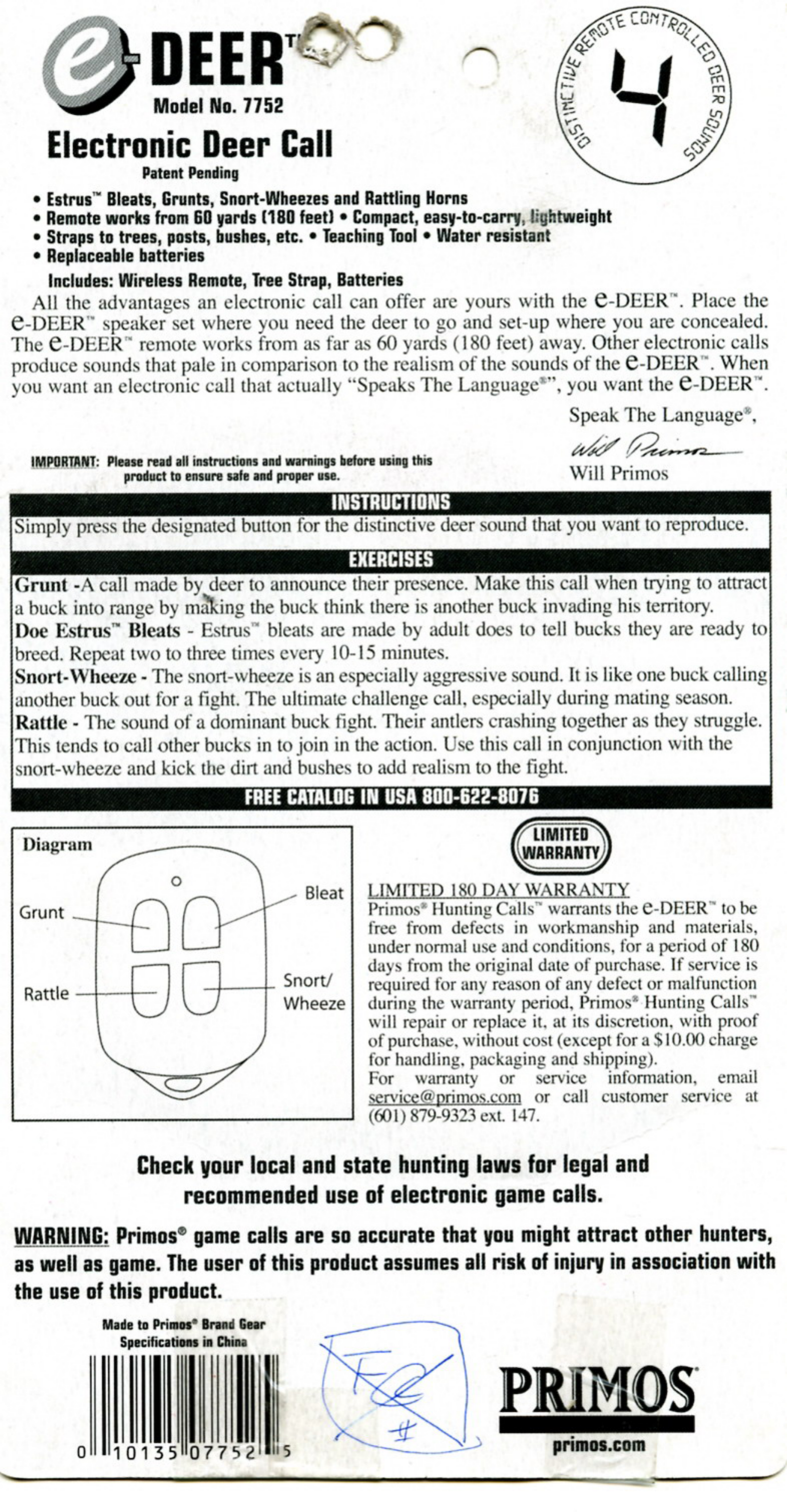 PRIMOS HUNTING CALLS 7752 e-DEER User Manual