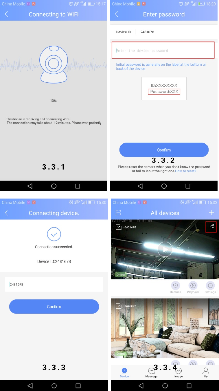 Select AP connection→input the Wi-Fi password asked by device and create visiting