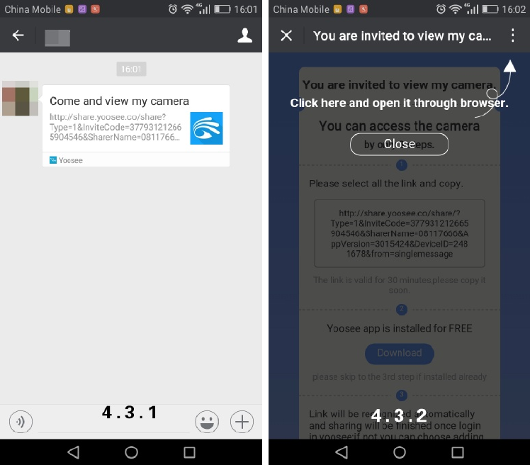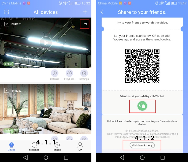1. Click on “sharing” button and enter into sharing interface (see pic.4.1.2) then share camera