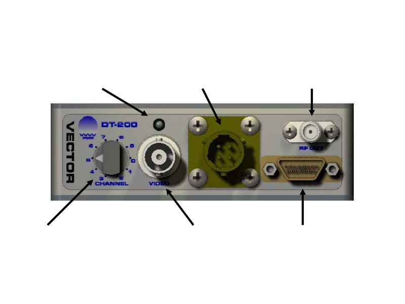 transmitter including power, antenna, video, and audio connections. The DT-200