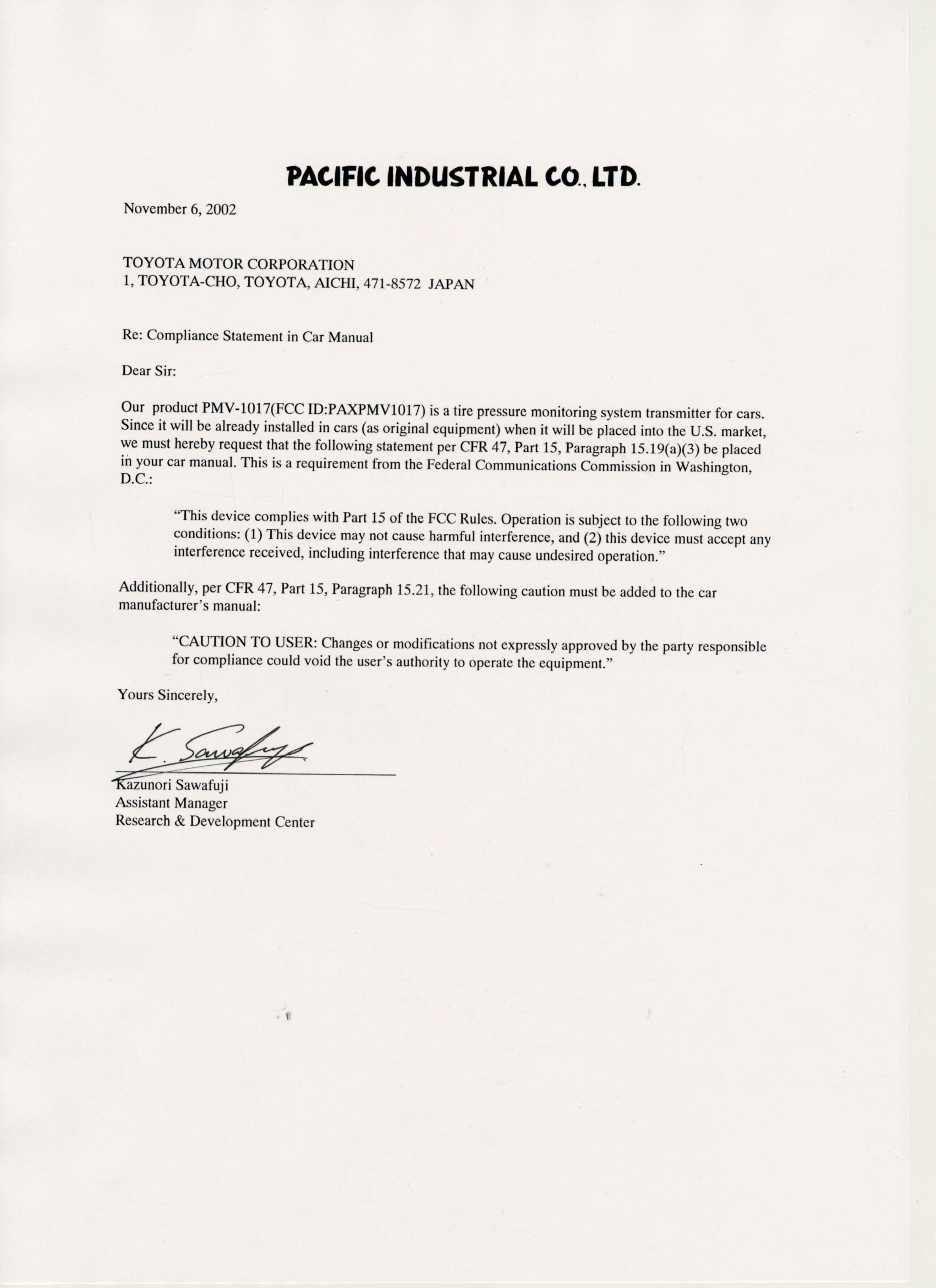 Pacific Industrial Company, LTD. Tire pressure monitoring system transmitter manual