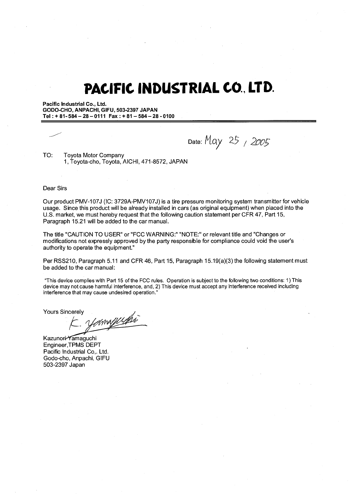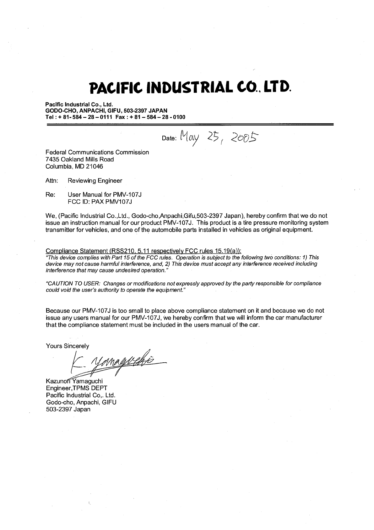 Pacific Industrial Company, LTD. Tire Pressure Monitor System Transmitter