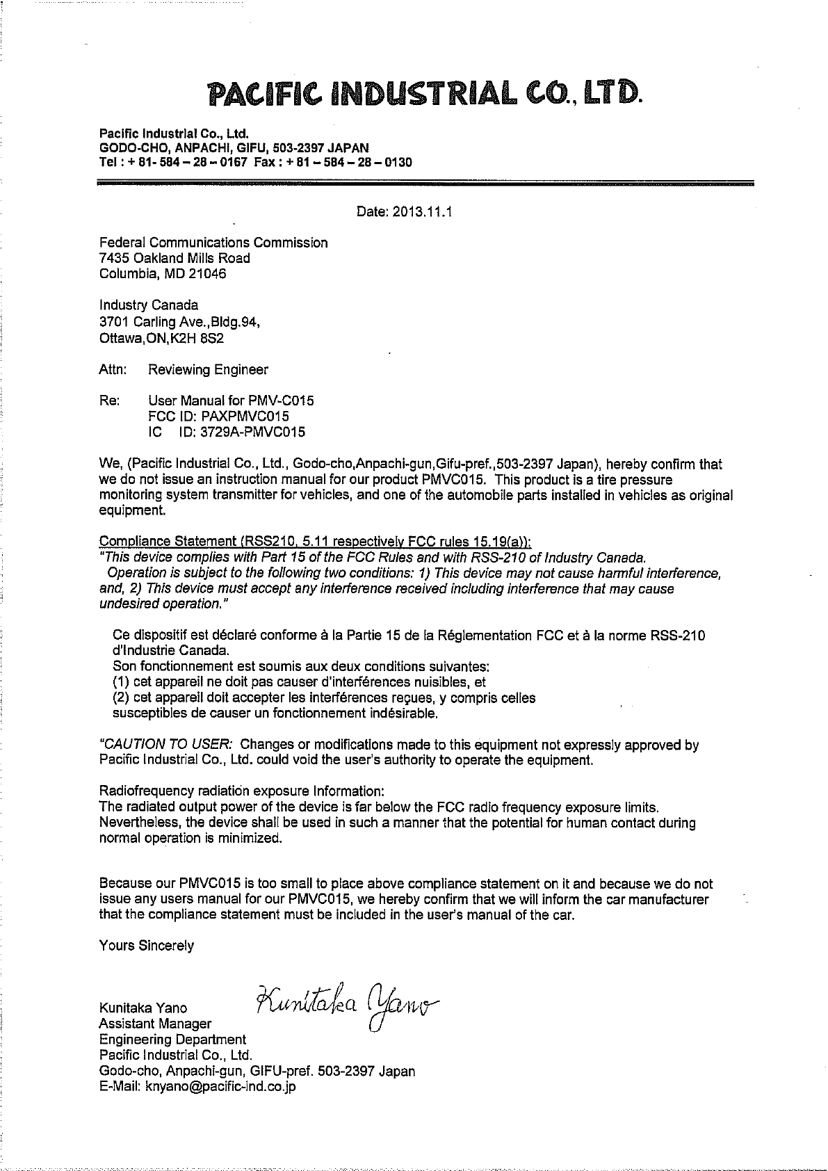 Pacific Industrial Company, LTD. TPMS Transmitter