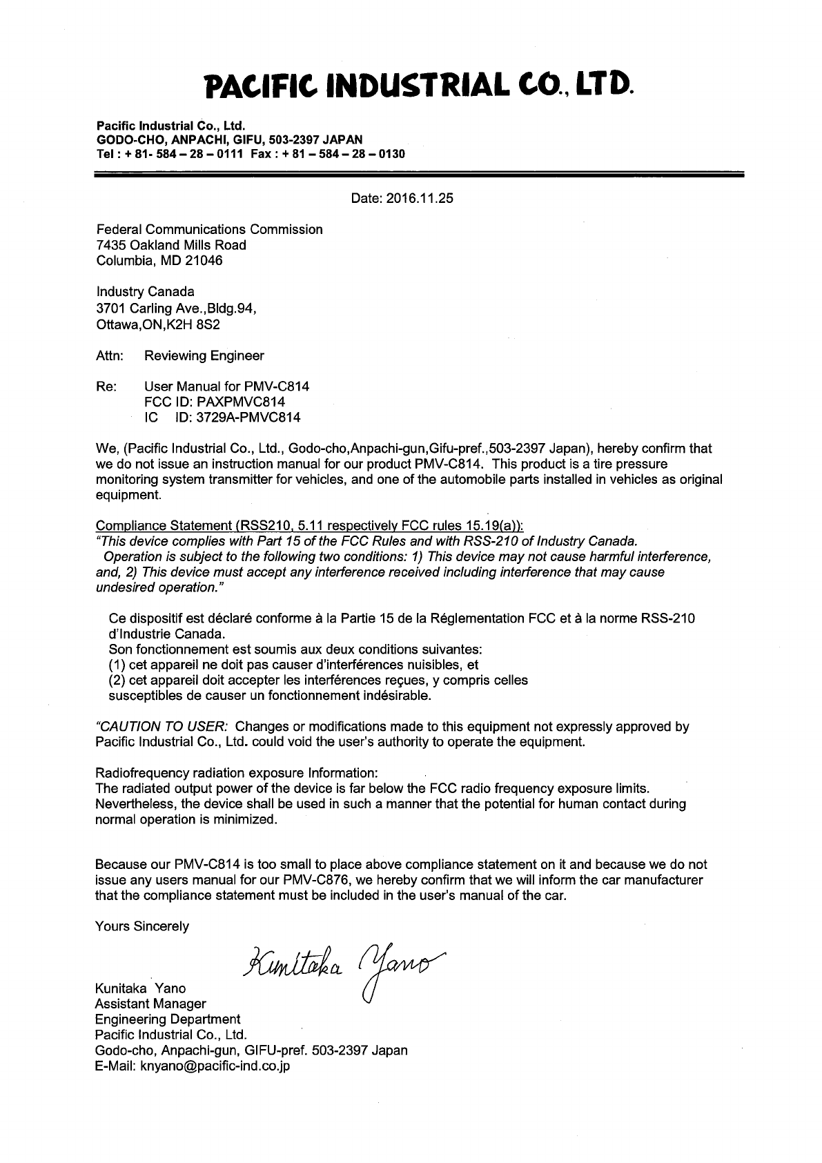 Pacific Industrial Company, LTD. TPMS Transmitter Manual Letter