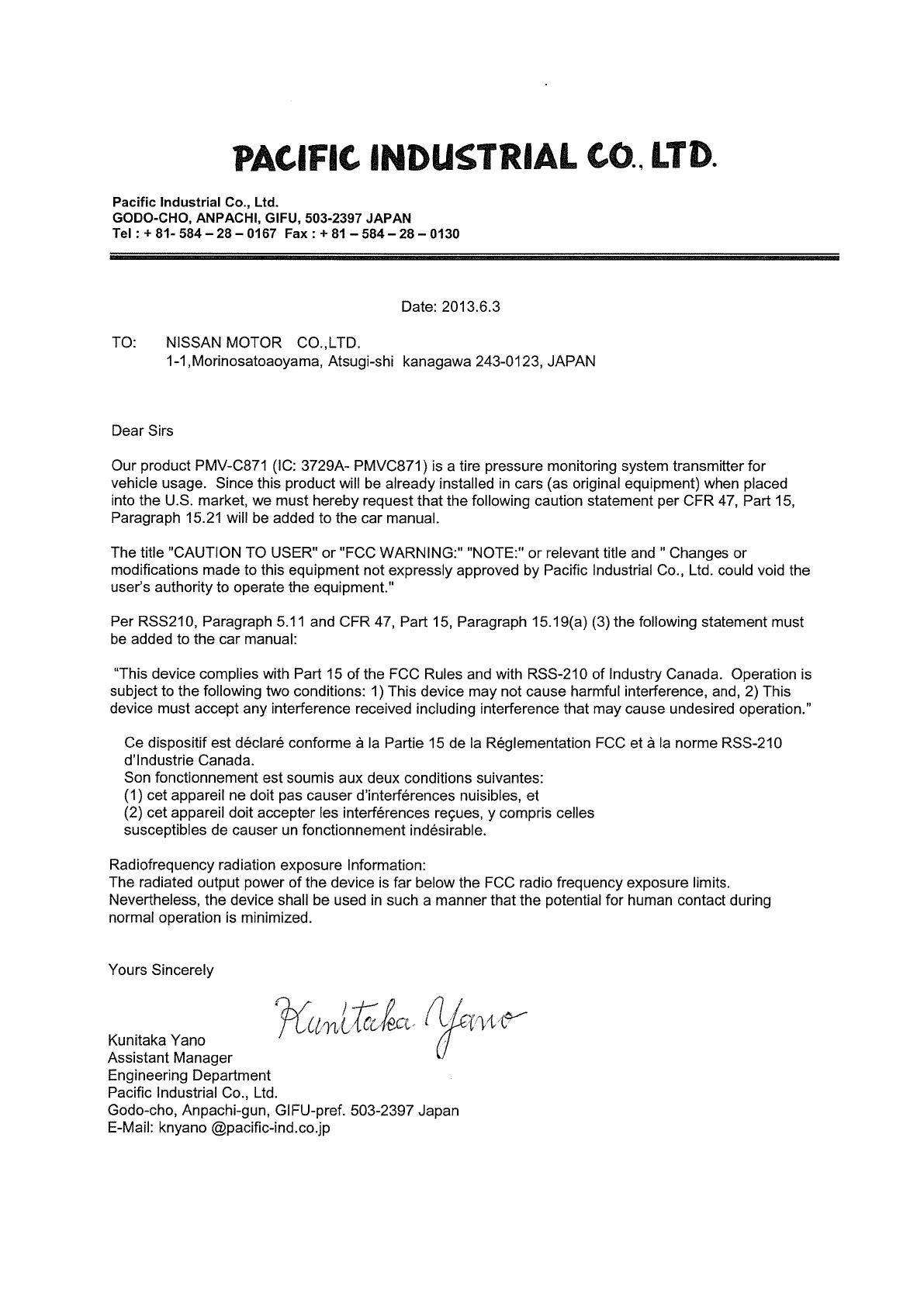 Pacific Industrial Company, LTD. TPMS Transmitter Manual Letter