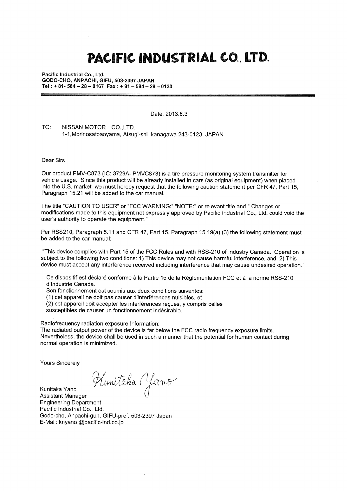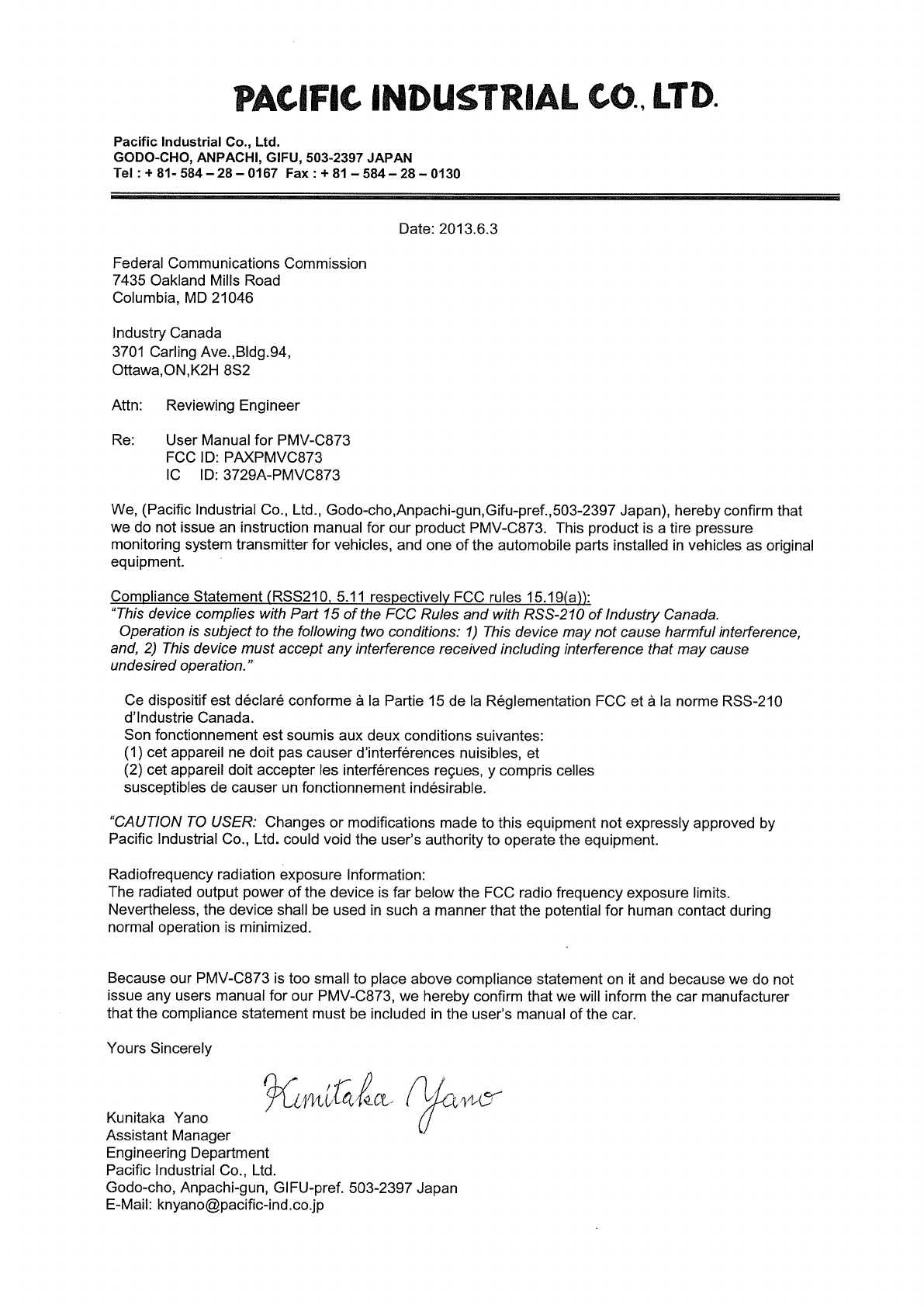 Pacific Industrial Company, LTD. TPMS Transmitter Manual Letter