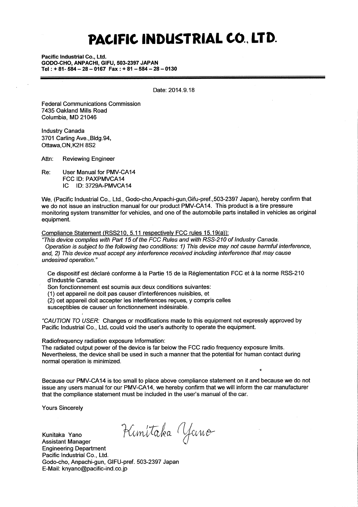 Pacific Industrial Company, LTD. TPMS Transmitter Users Manual