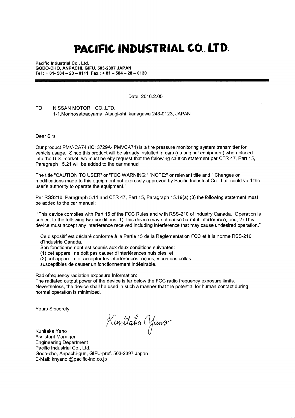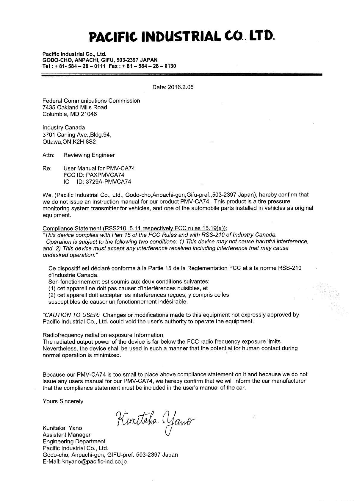 Pacific Industrial Company, LTD. TPMS Transmitter