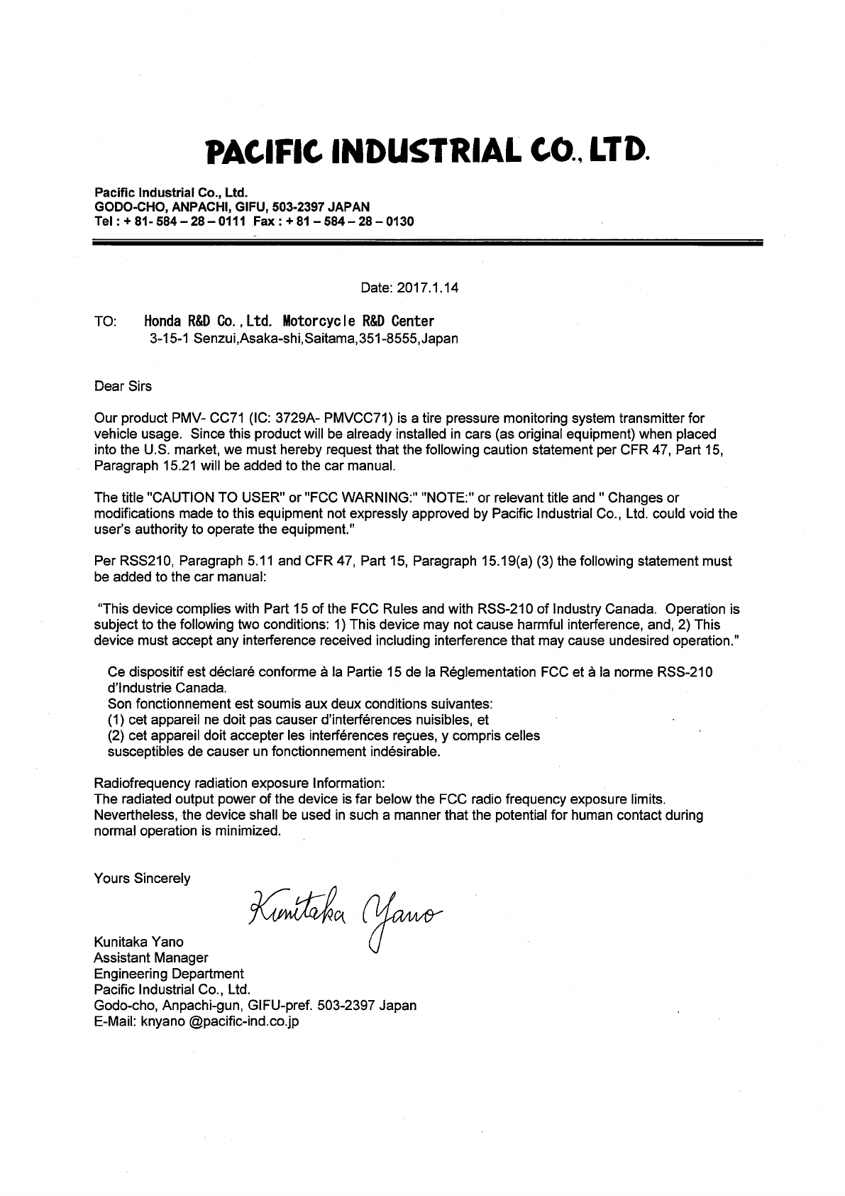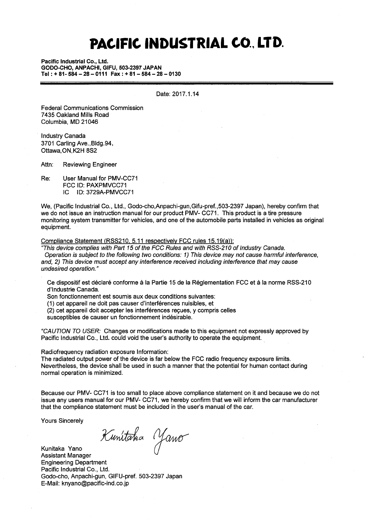Pacific Industrial Company, LTD. TPMS Transmitter Manual Letter