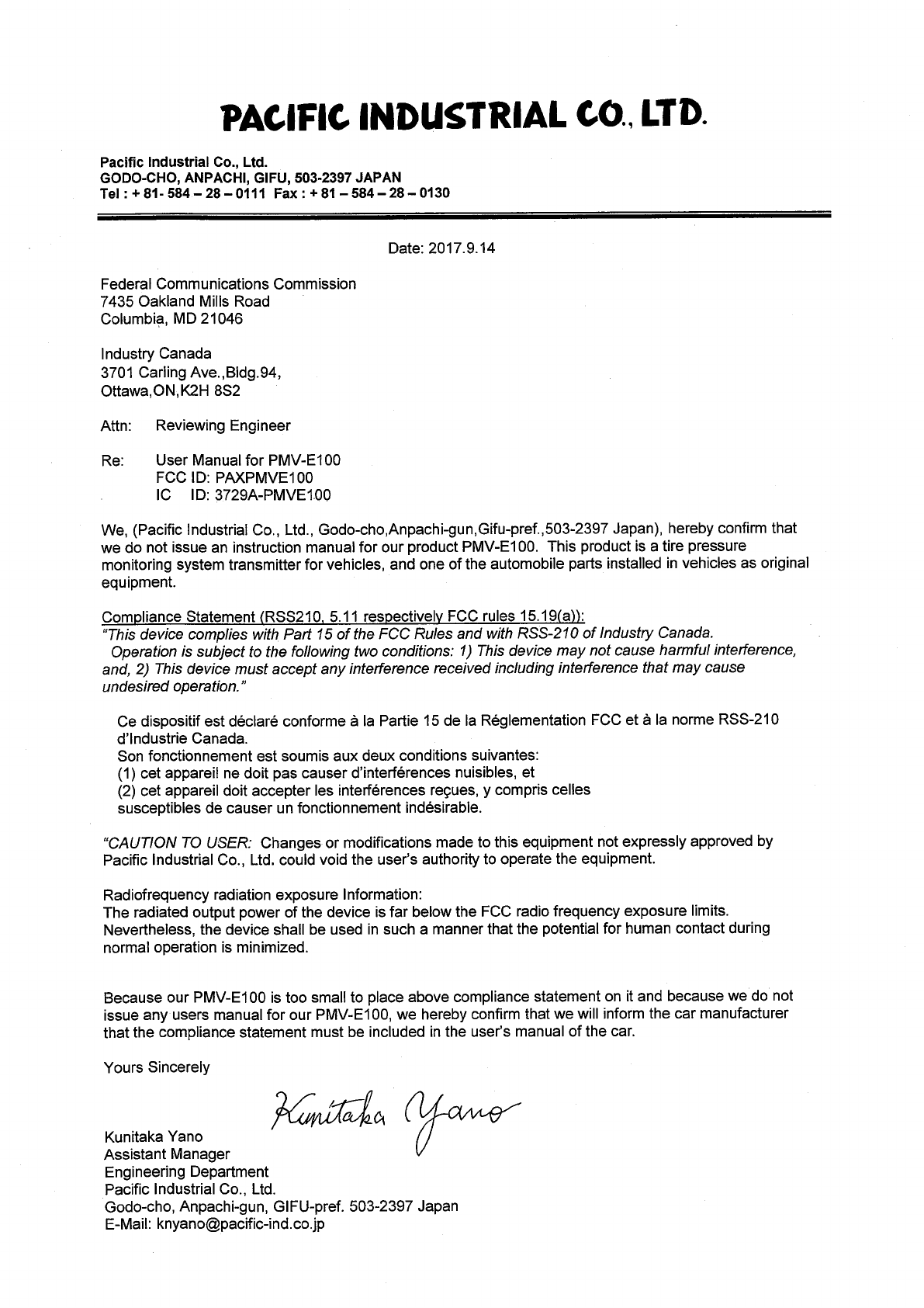 Pacific Industrial Company, LTD. TPMS Transmitter