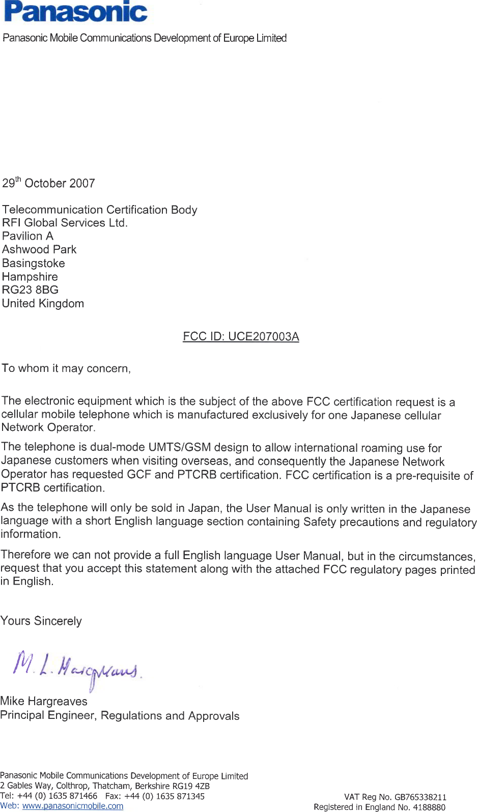 Panasonic Connect 207003A UMTS/ GSM Cellular Mobile Radio with Bluetooth® User Manual 820P