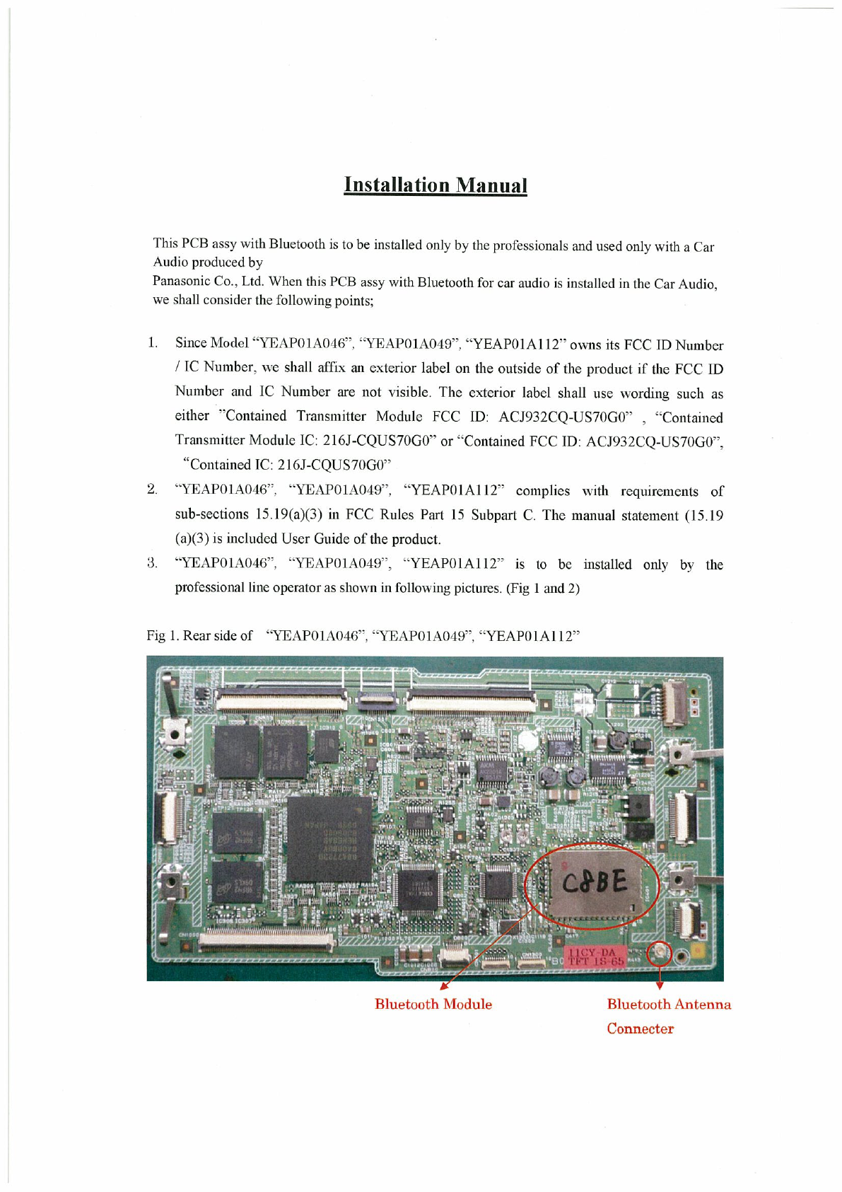 Panasonic of North America 932CQ-US70G0 Bluetooth Module Assy User Manual Installation manual