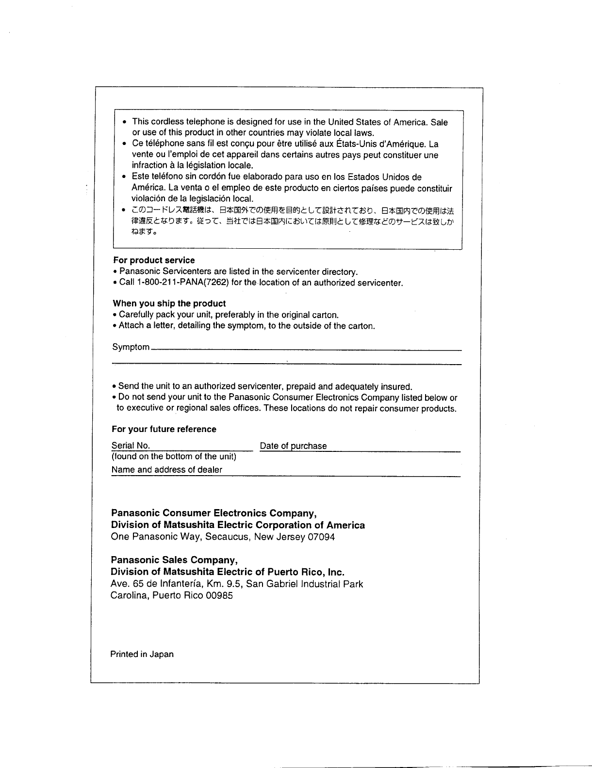 Panasonic Corporation of North America Cordless Phone Users Manual