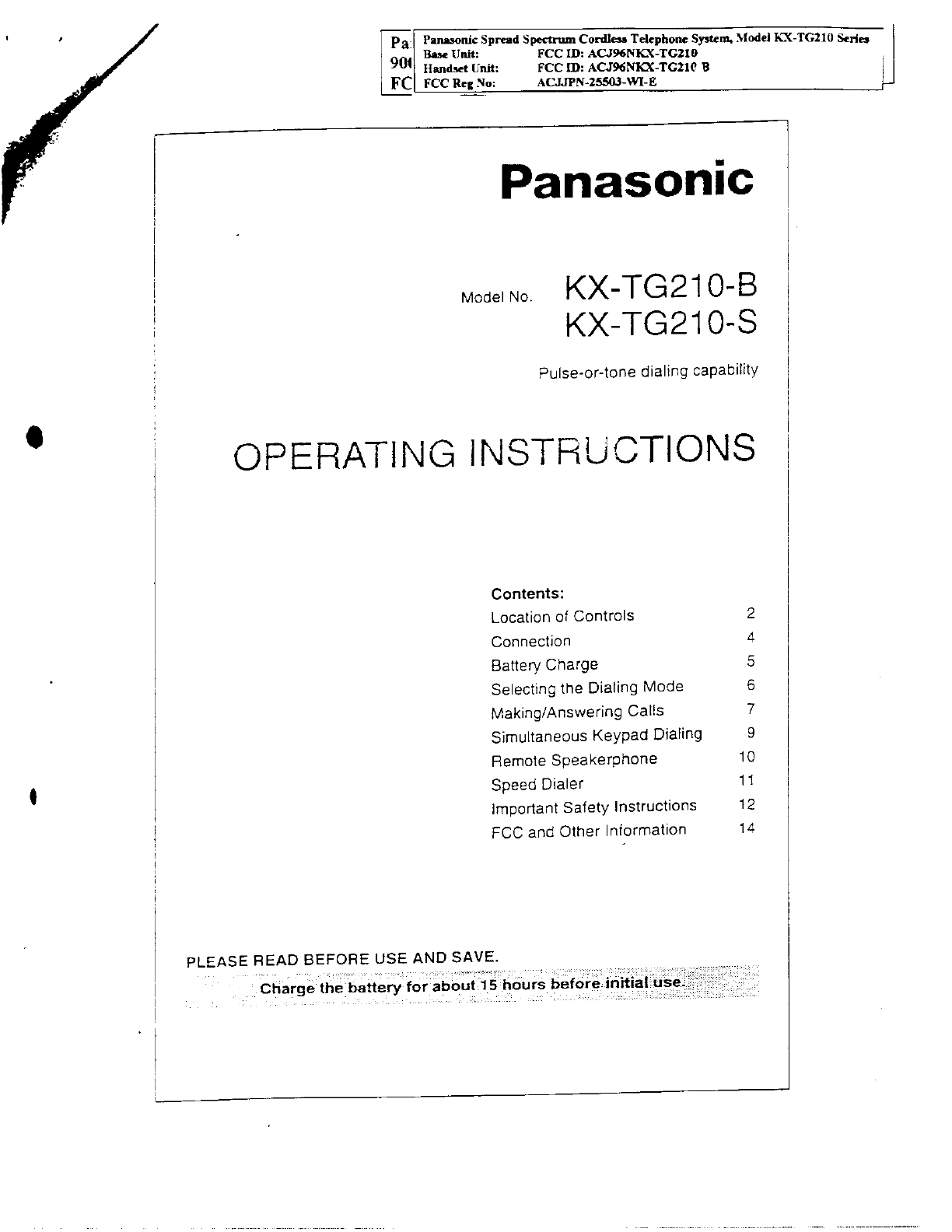 Panasonic of North America 96NKX-TG210B Cordless Telephone Handset Transmitter User Manual 53994