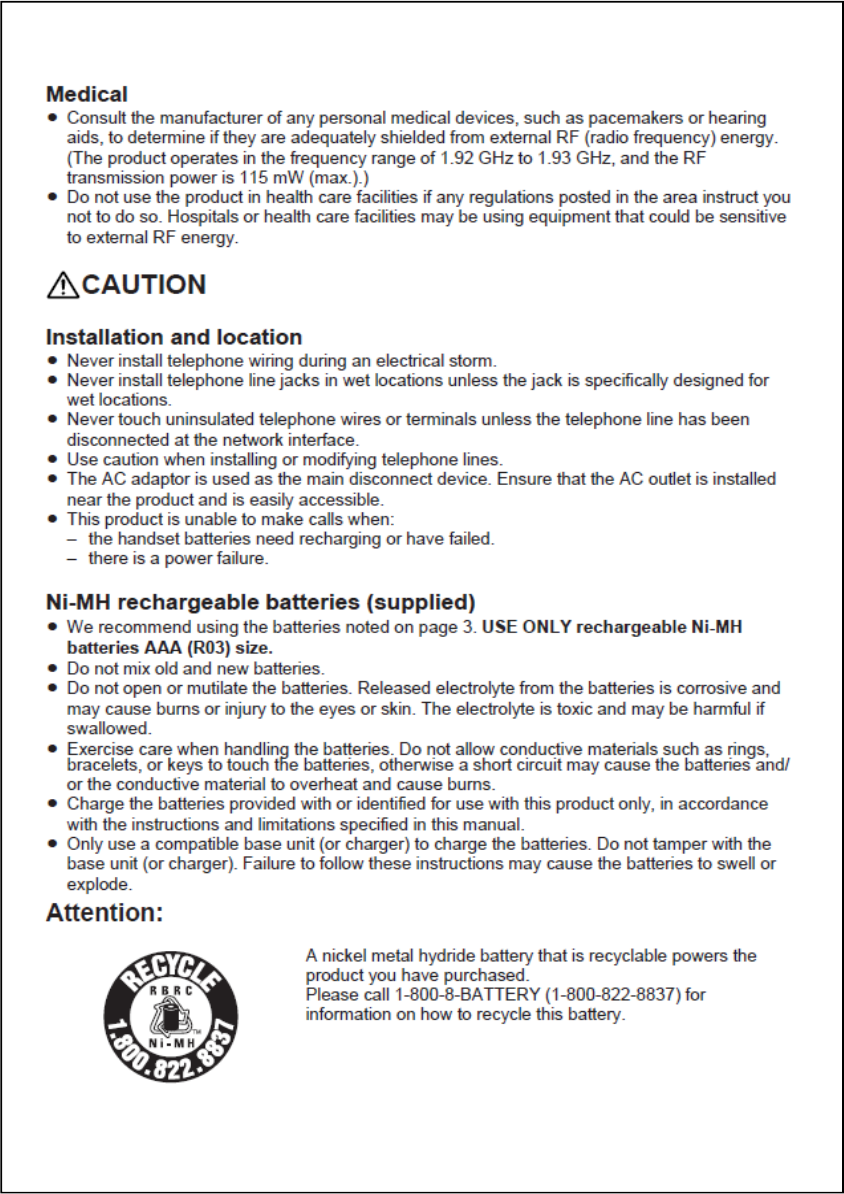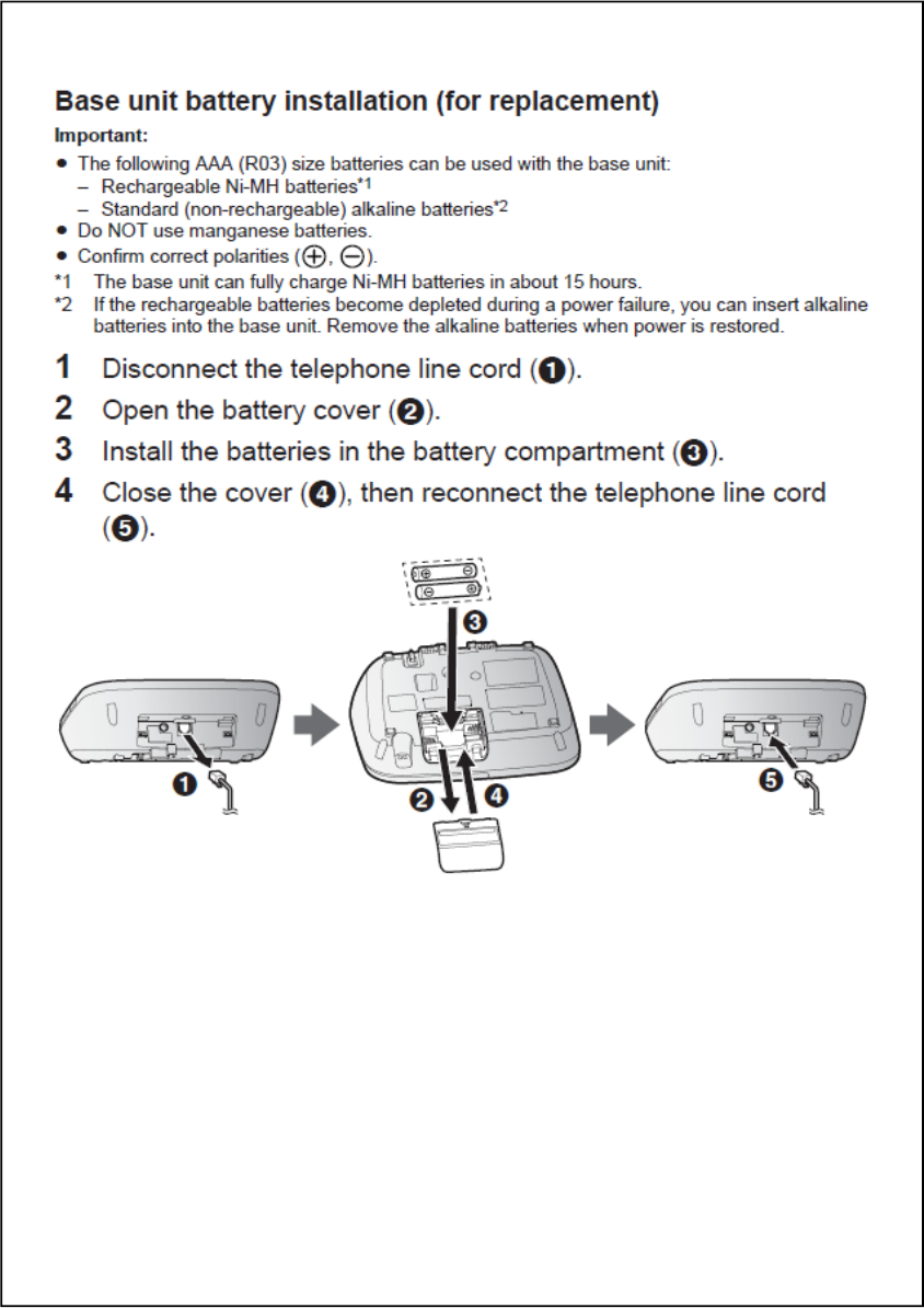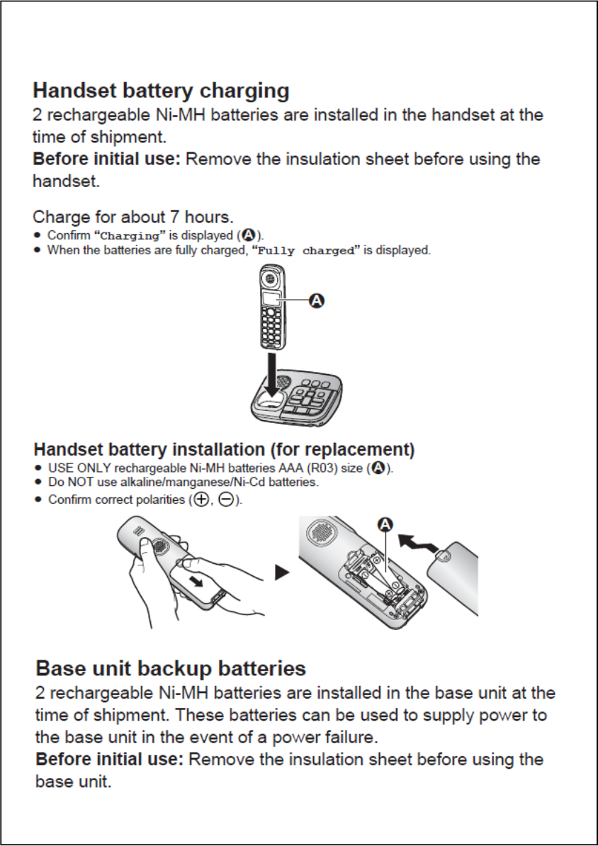 *3 The supplied rechargeable batteries in the handset and base unit are installed with insulation