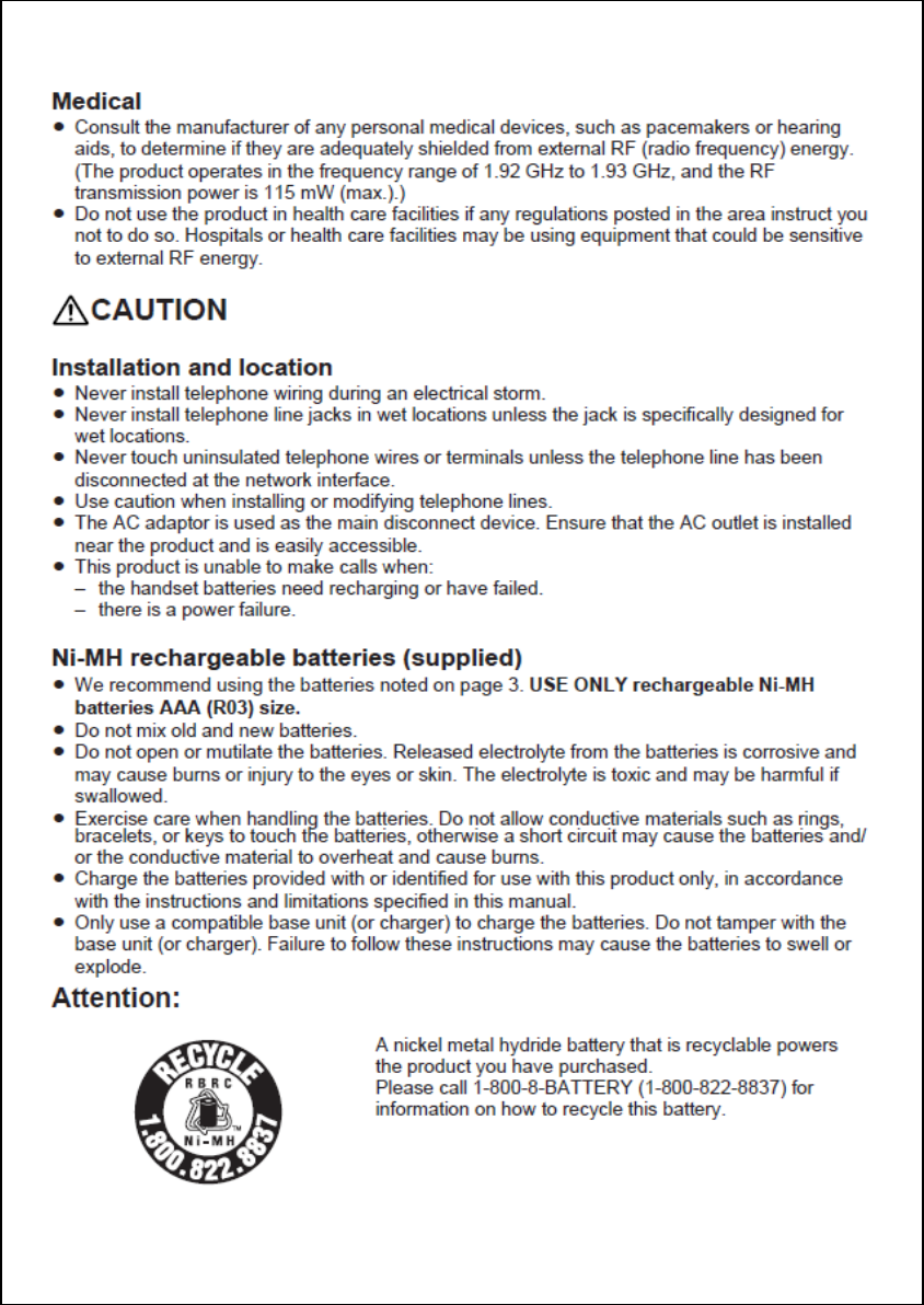 *4 The supplied rechargeable batteries in the handset and base unit are installed with insulation