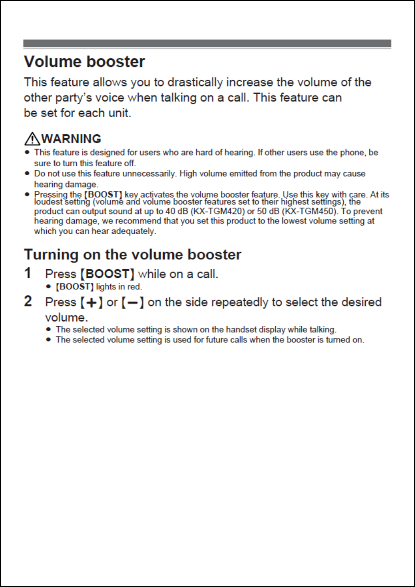 Receiver volume for outside calls is adjustable up to 40 dB (when the booster is on).