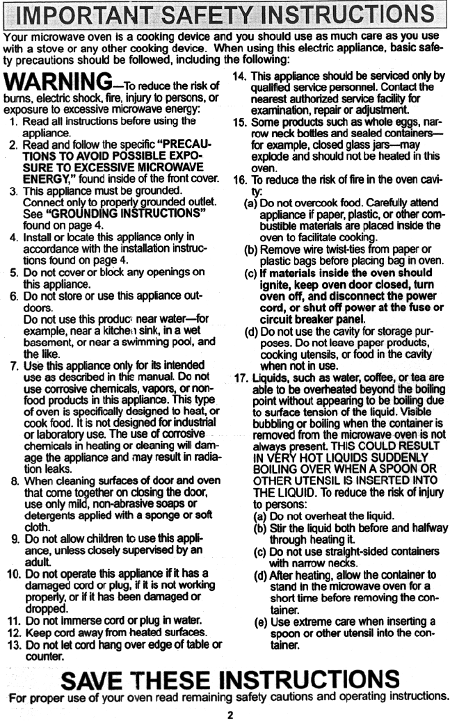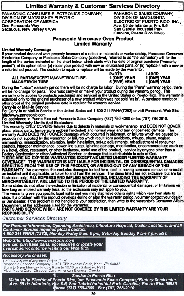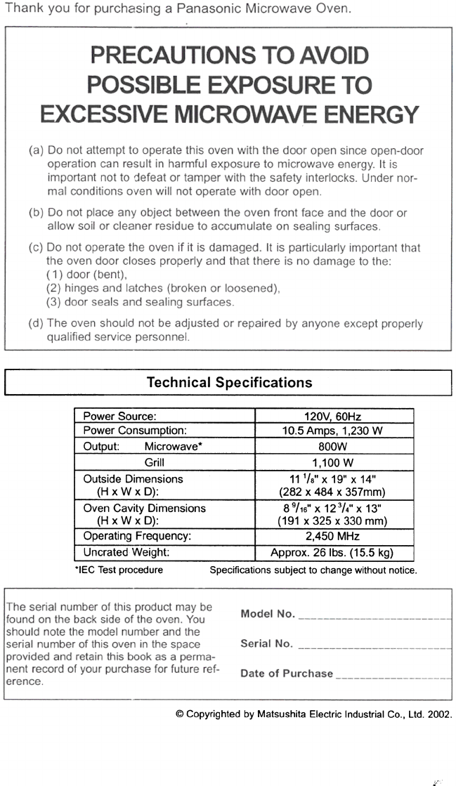 Panasonic Appliance Company of America Microwave Oven Users Manual and Operating Instructions