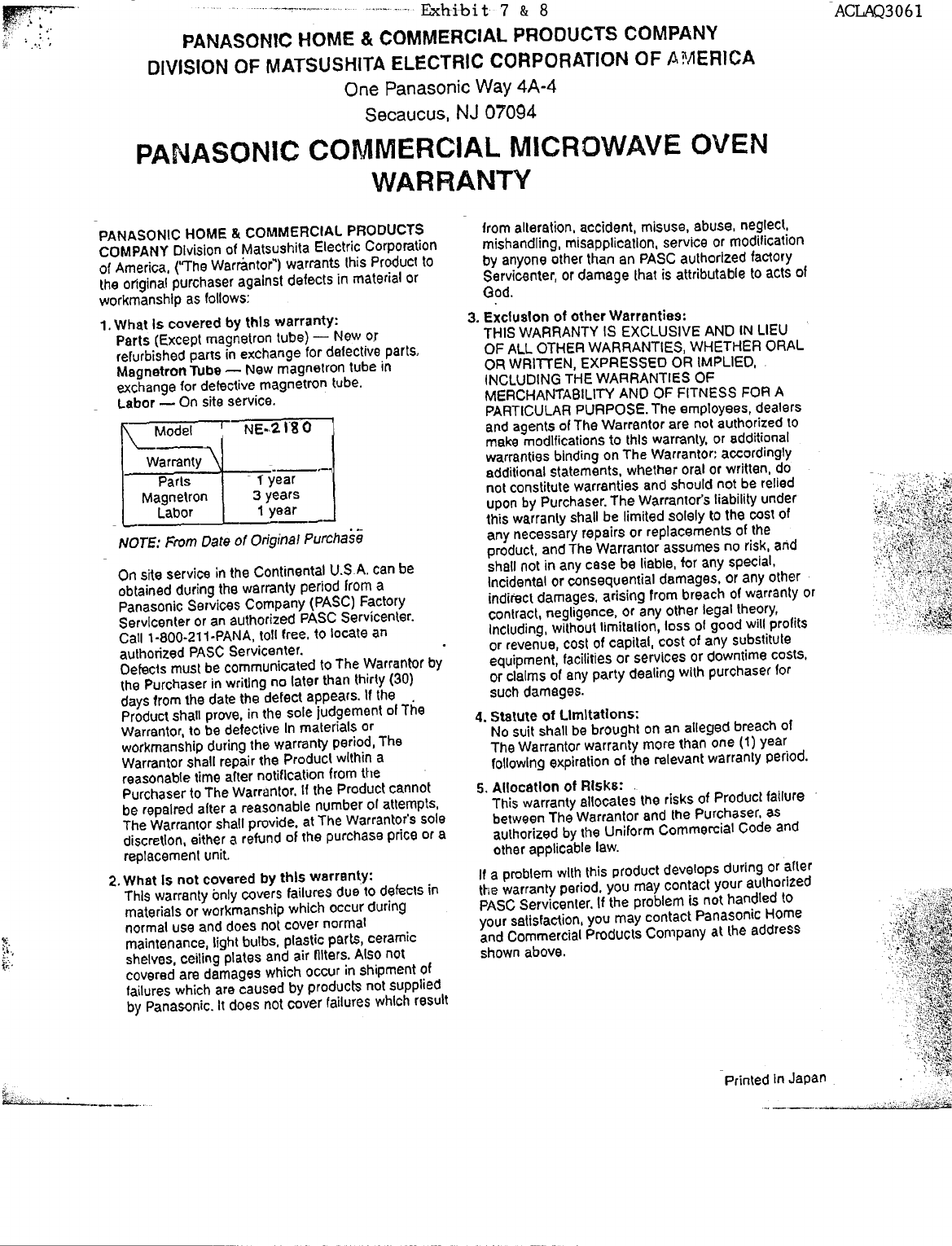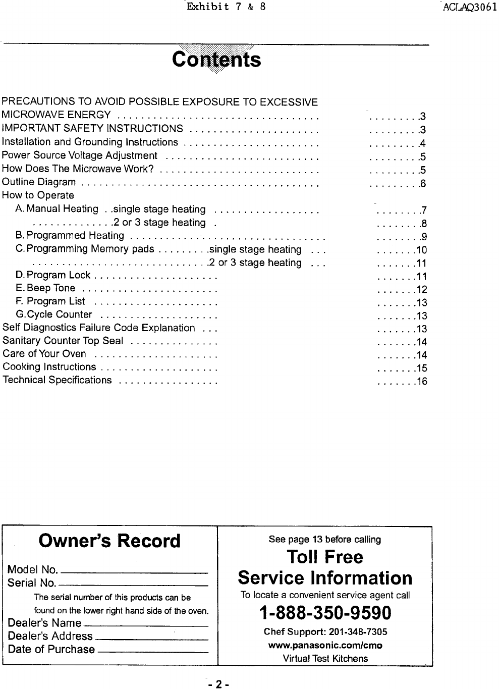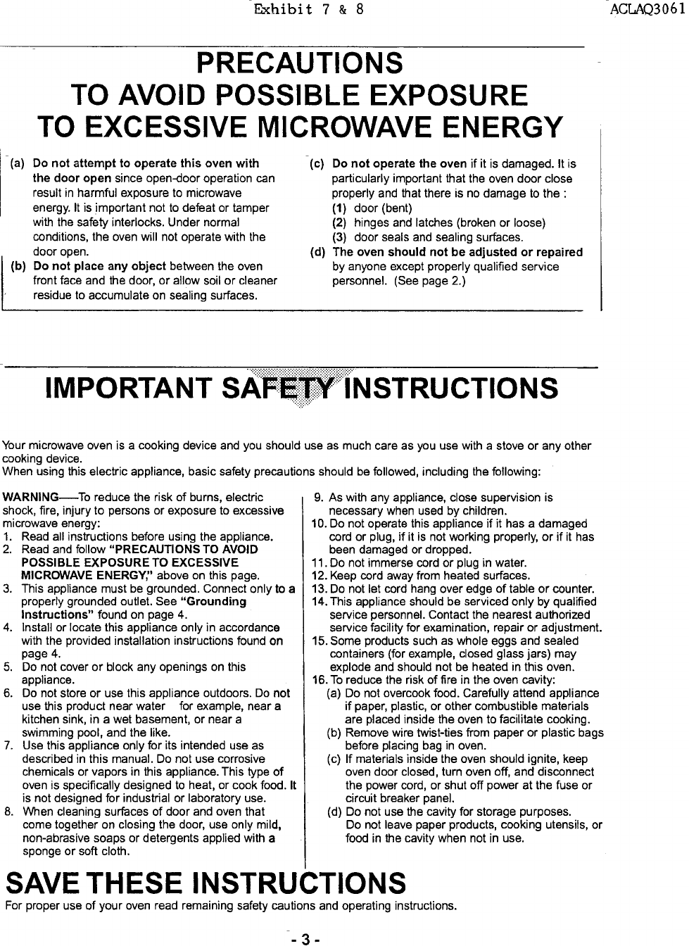 Panasonic of North America AQ3061 Microwave Oven User Manual Operating and Installation Instructions and Specs