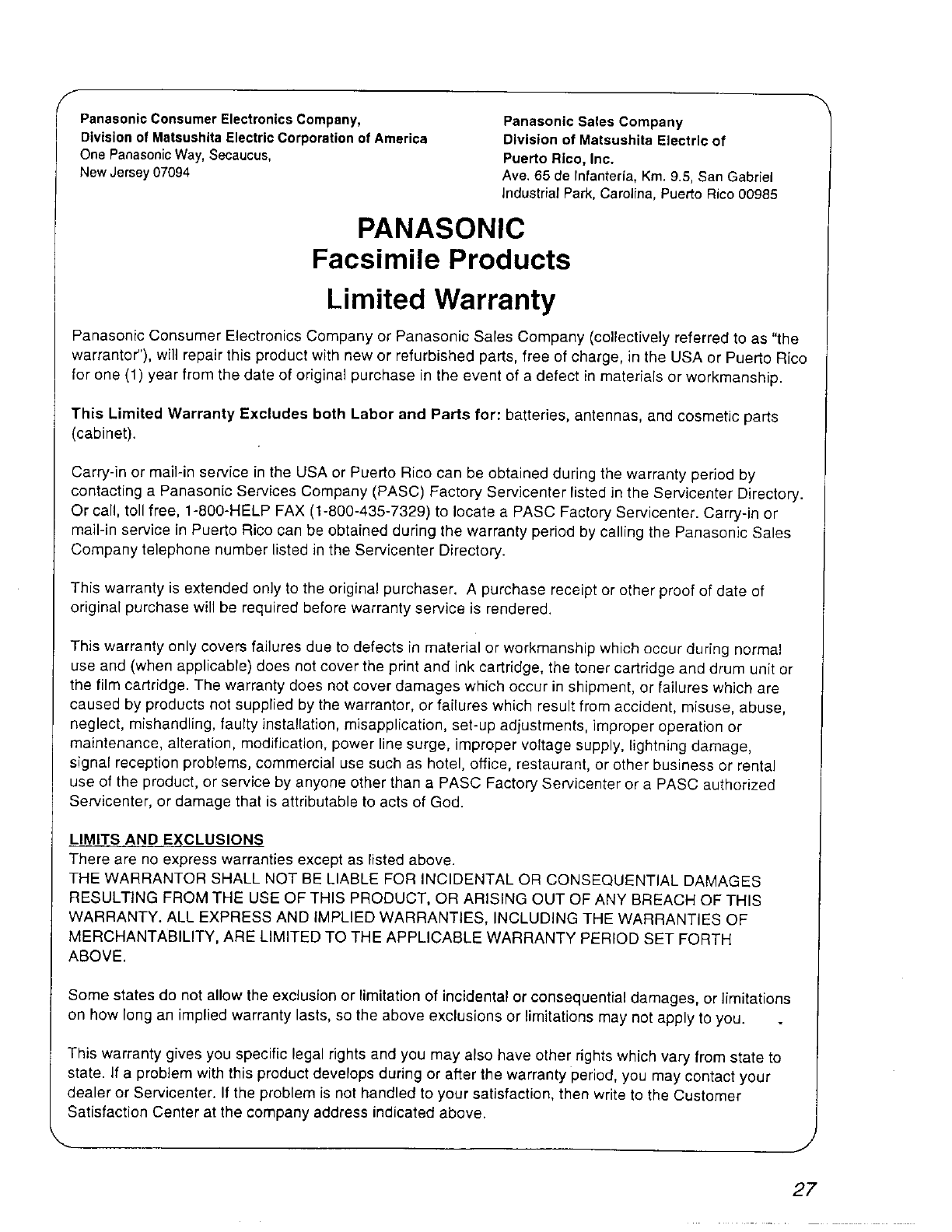 Panasonic Corporation of North America Facsimile Machine with Serial Port 43144