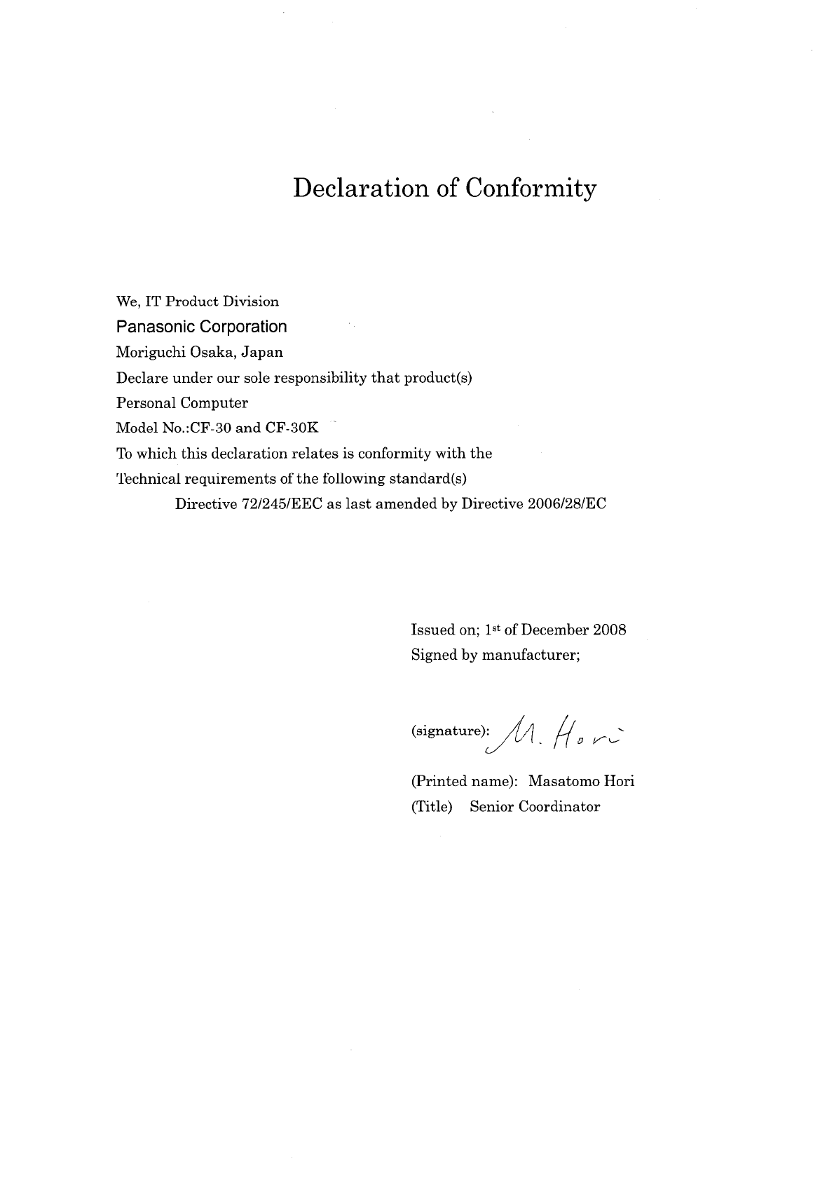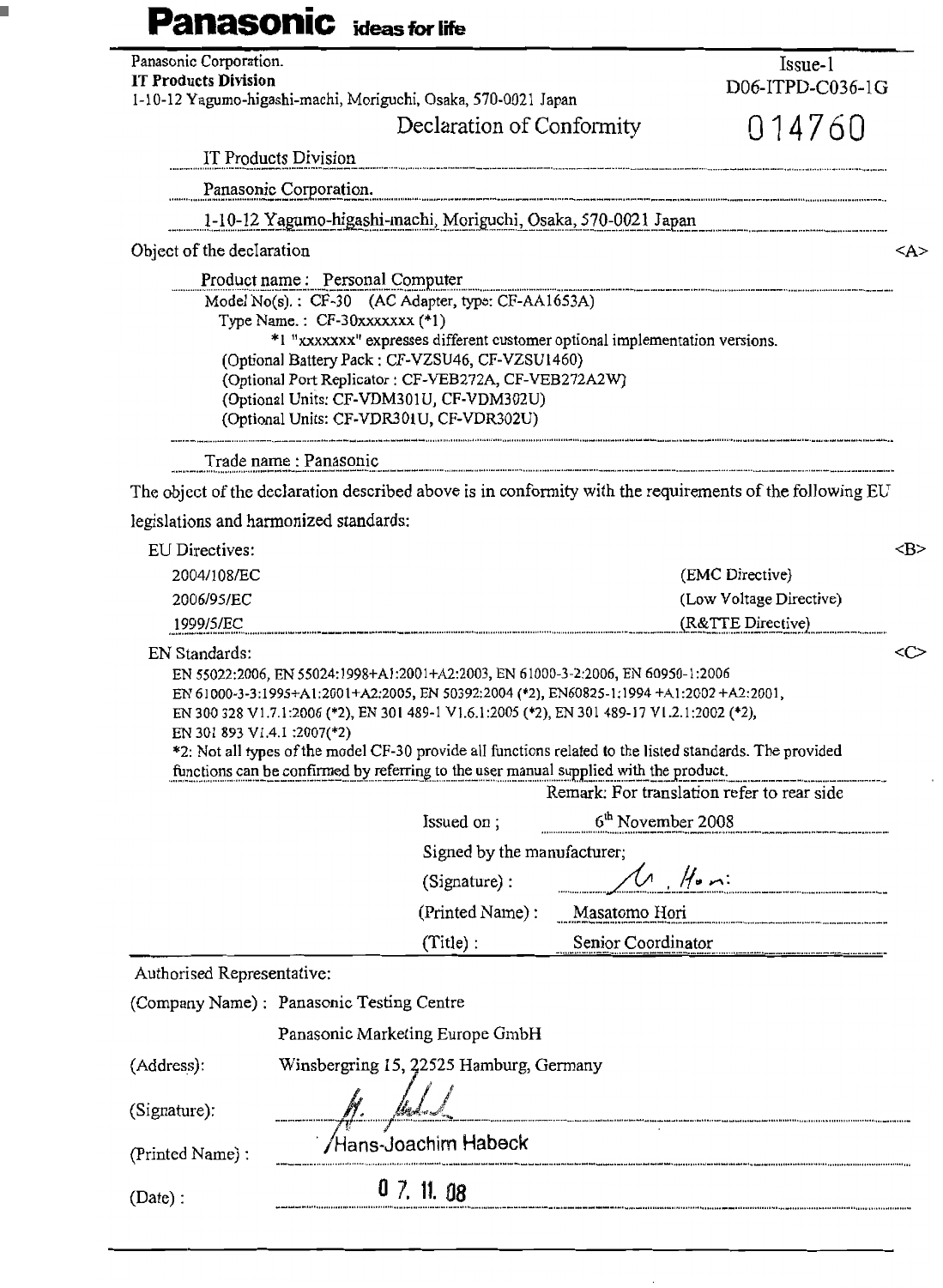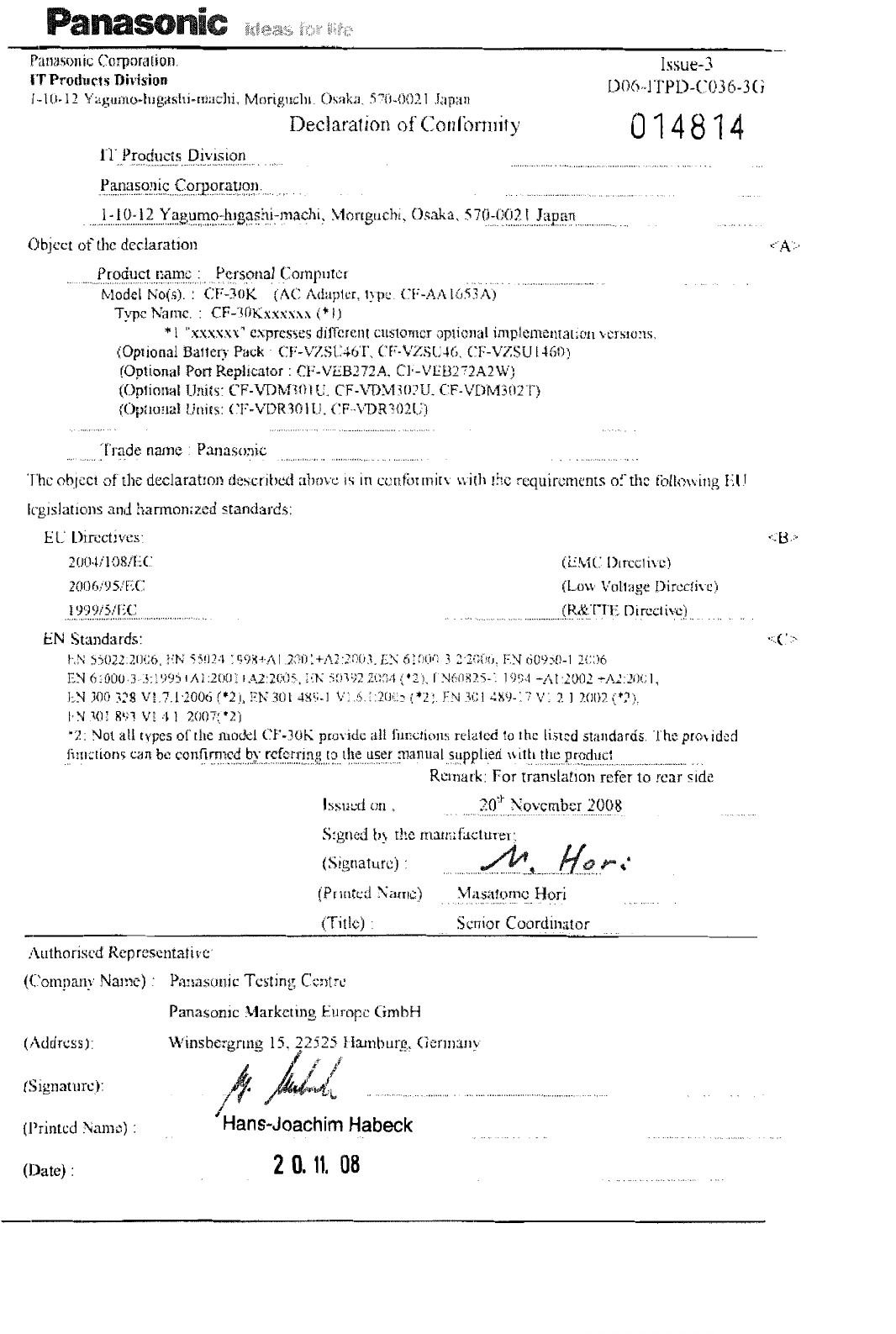 Panasonic CF 30K/L (For 30KTP15AW‚ 30LTP15AW) Windows XP Pro (Mar 19‚ 2009) Read Me First User Manual : Safety Warnning(Japanese/ English/ German/ French/ Italian/ Spanish/ Swedish/ Chinese[S]/ Chinese[T]/ Korean/ Portuguese[Brazi 30mk3 Safetywarning Dfqw5268za Nonlogo 33lang P20090026