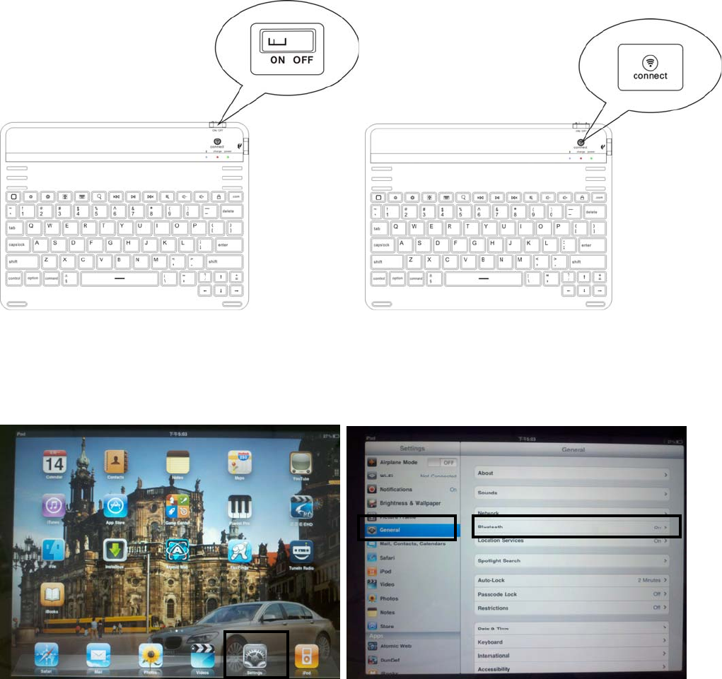 (1)、As shown in figure, will turn to switch ON keyboard Power in three seconds, Bluetooth