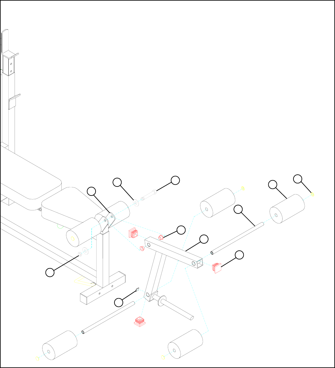 • Slide two ROLLER PADS (12) over each end of the SHAFT of the LEG EXTENSION NECK (7), as shown in FIGURE 7, and