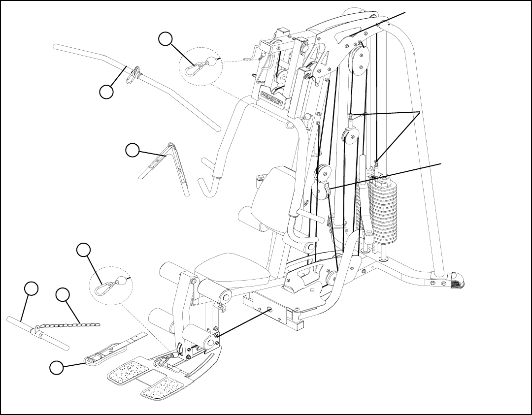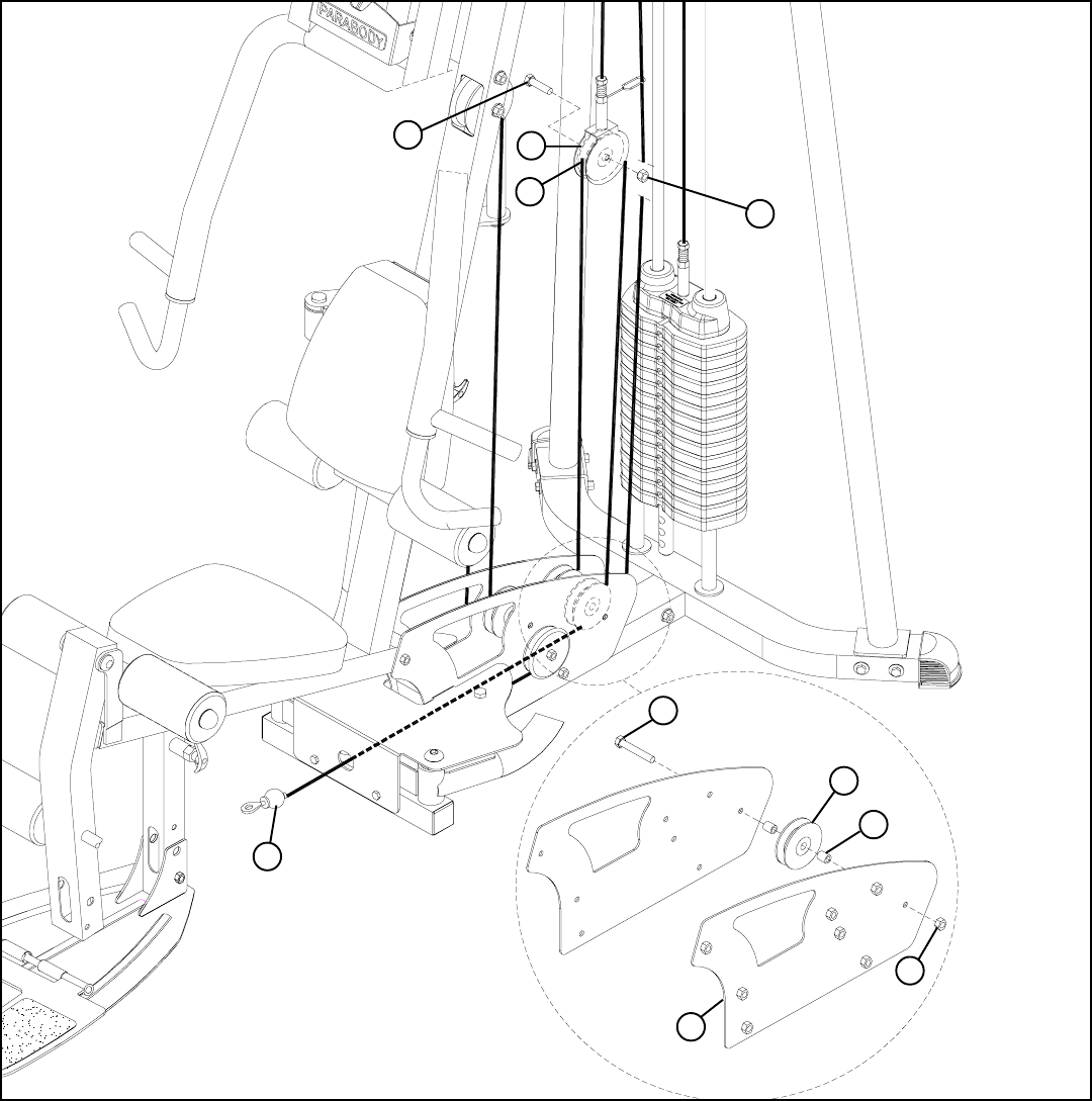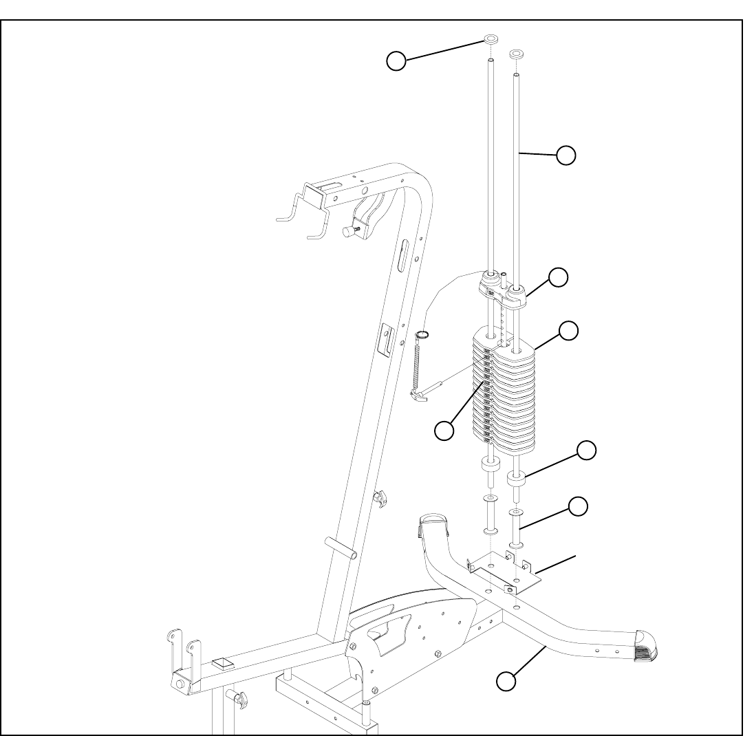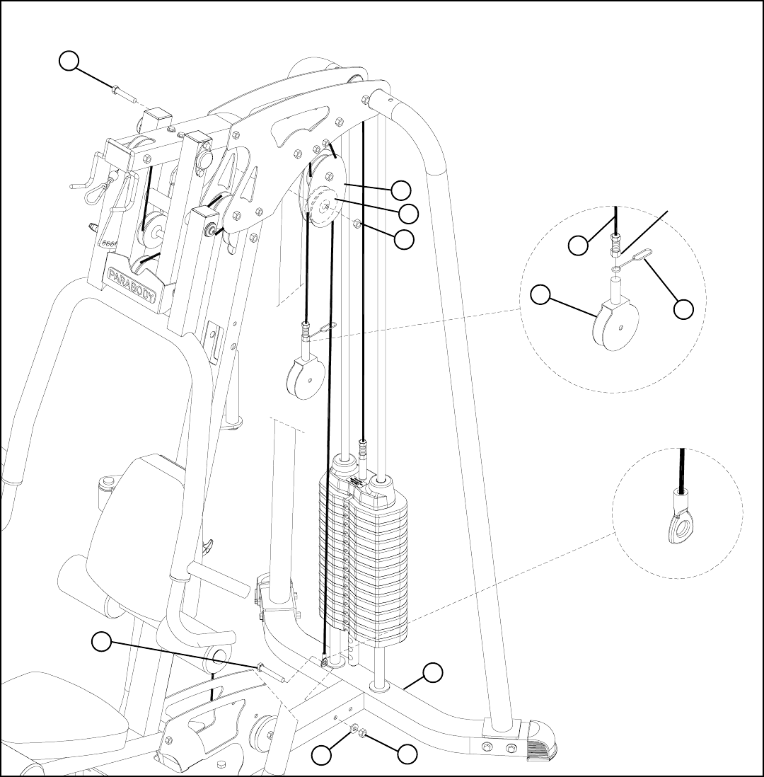 shafts, allen head bolts, weight selector pin, weight stack shaft, set screws, protector caps, adjustment chain, cotter pin, plunger, spring