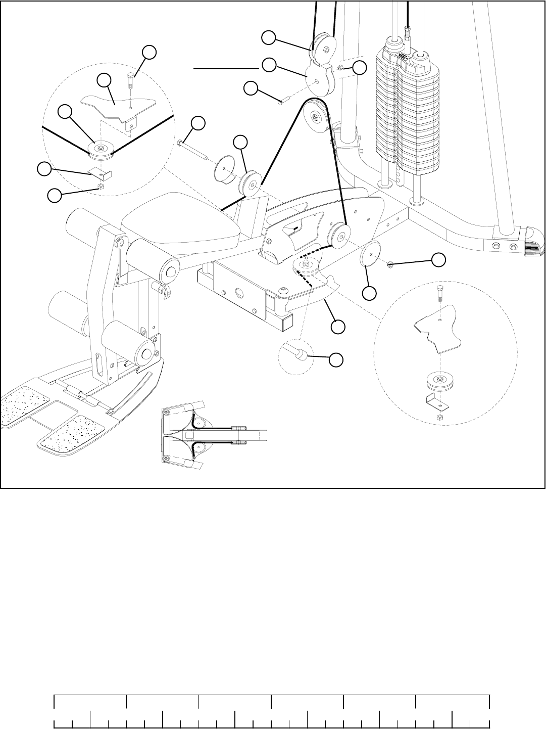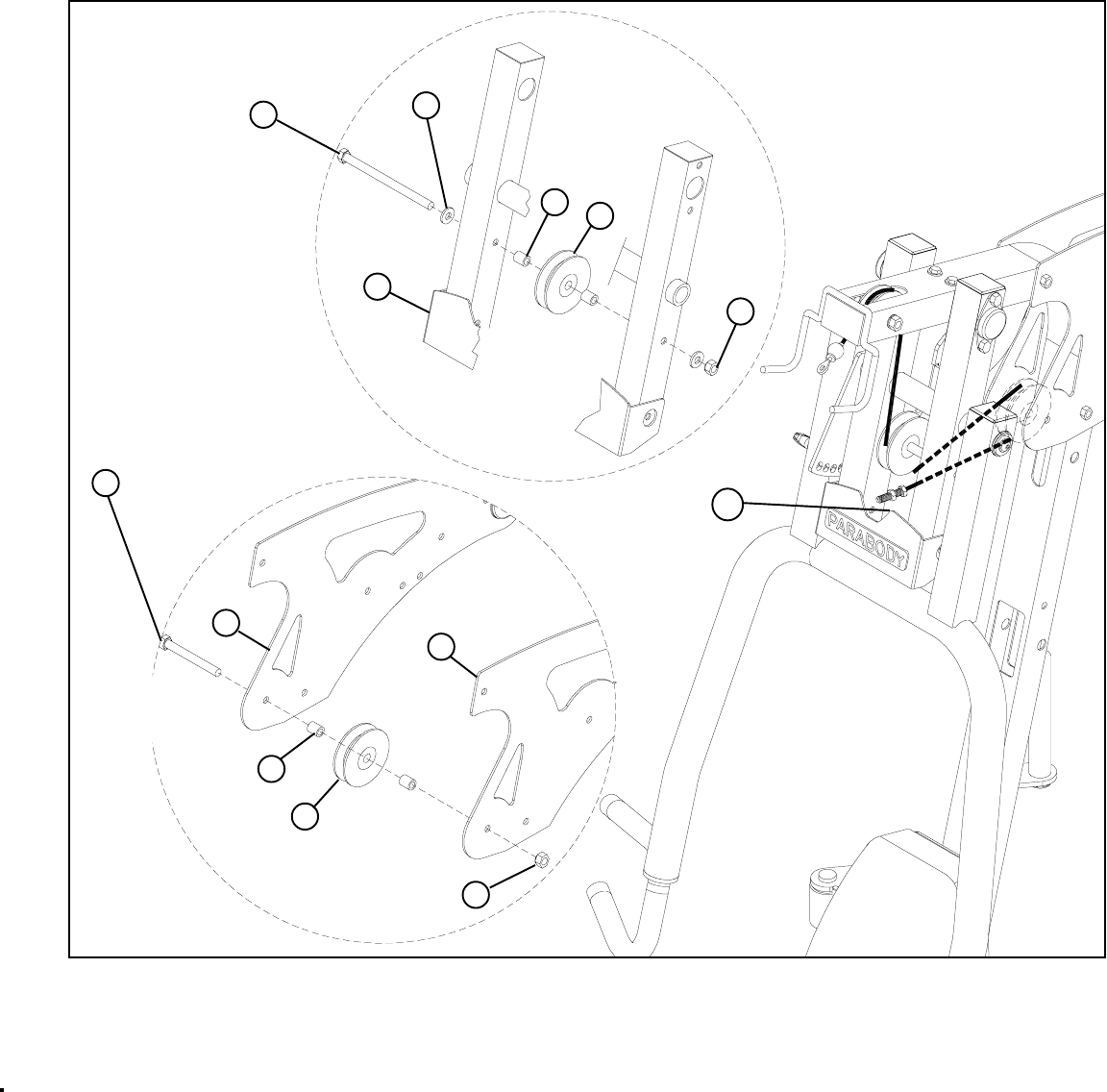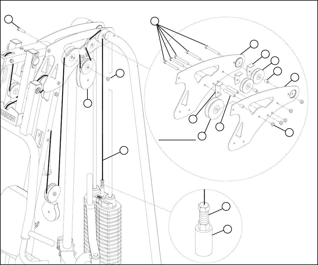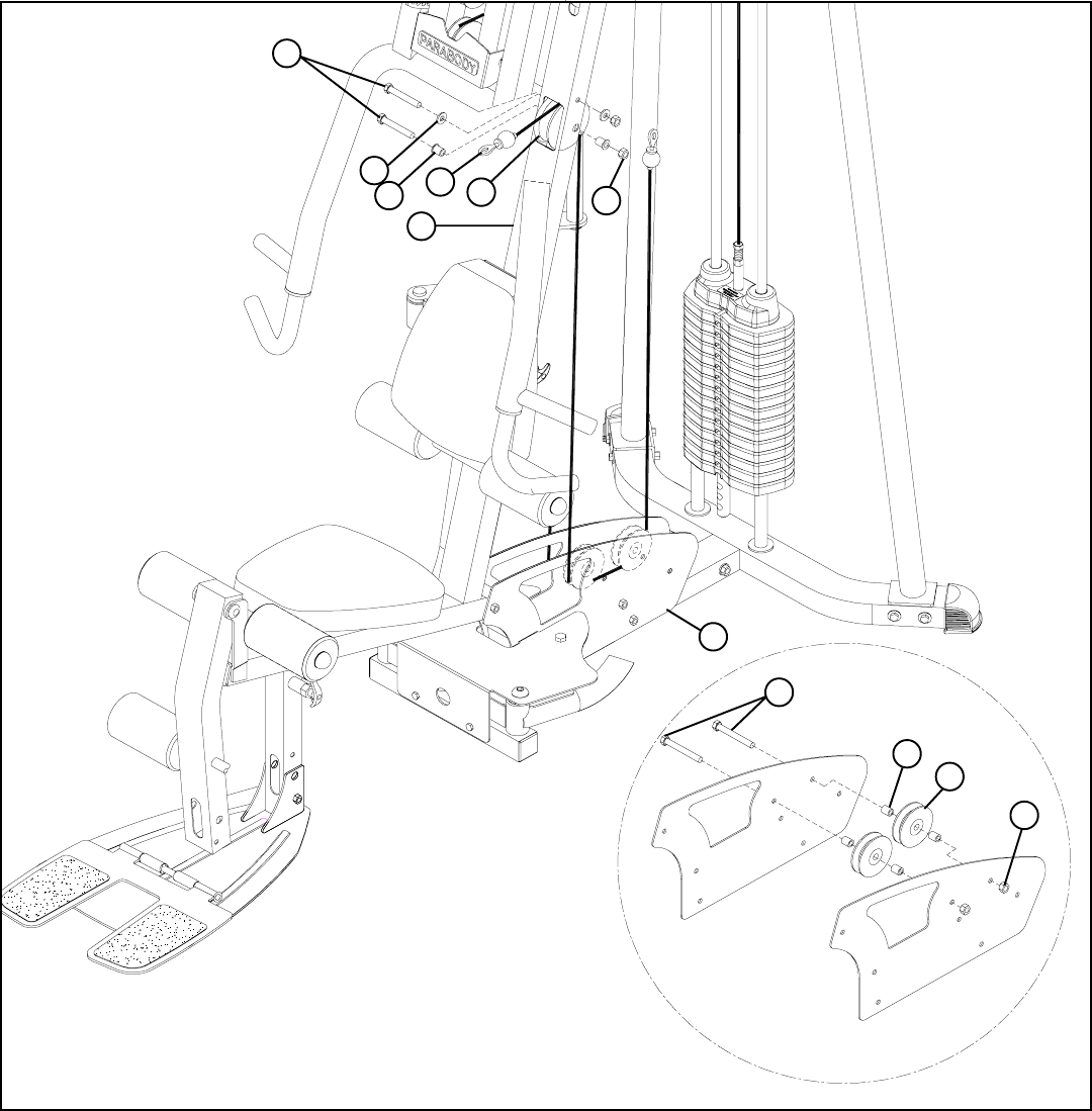 shafts, allen head bolts, weight selector pin, weight stack shaft, set screws, protector caps, adjustment chain, cotter pin, plunger, spring