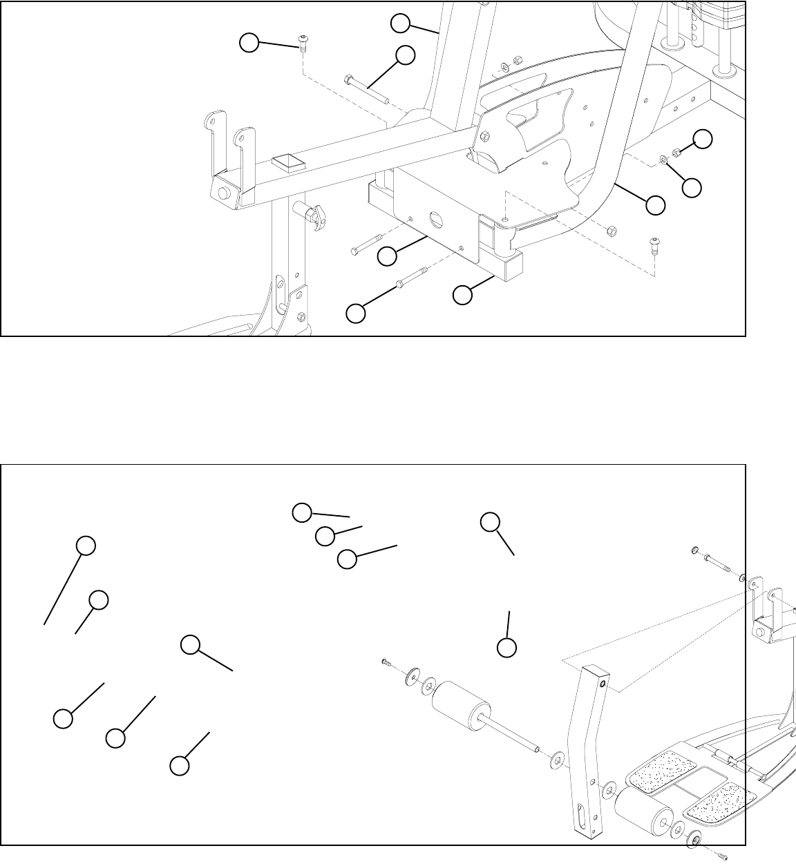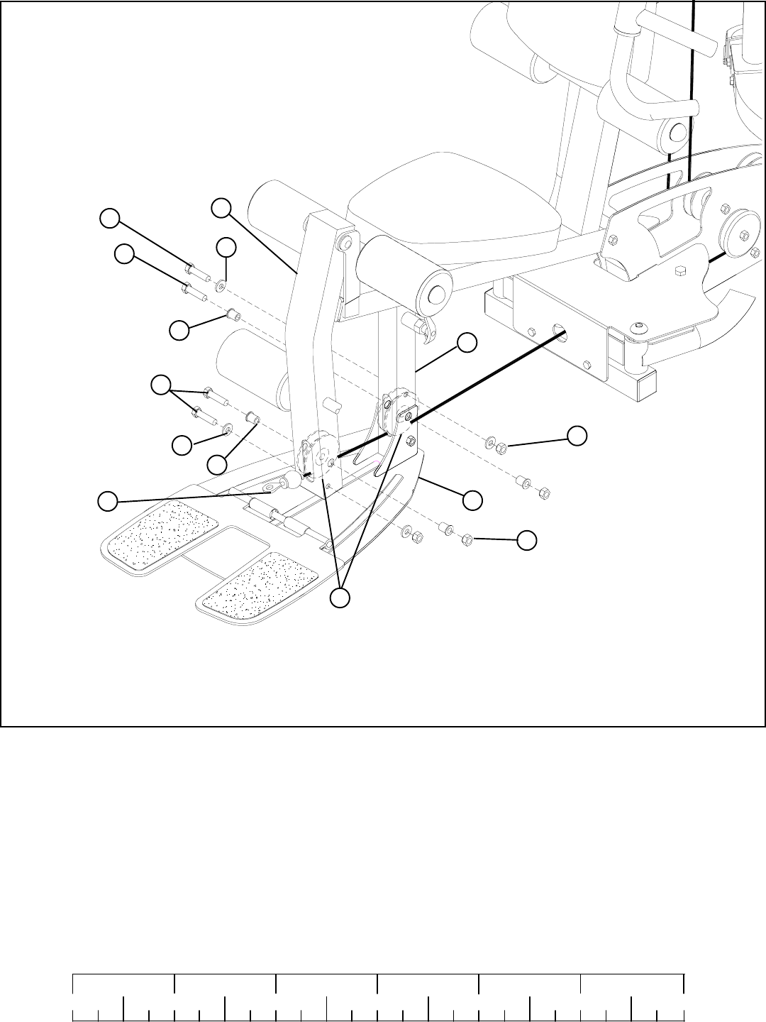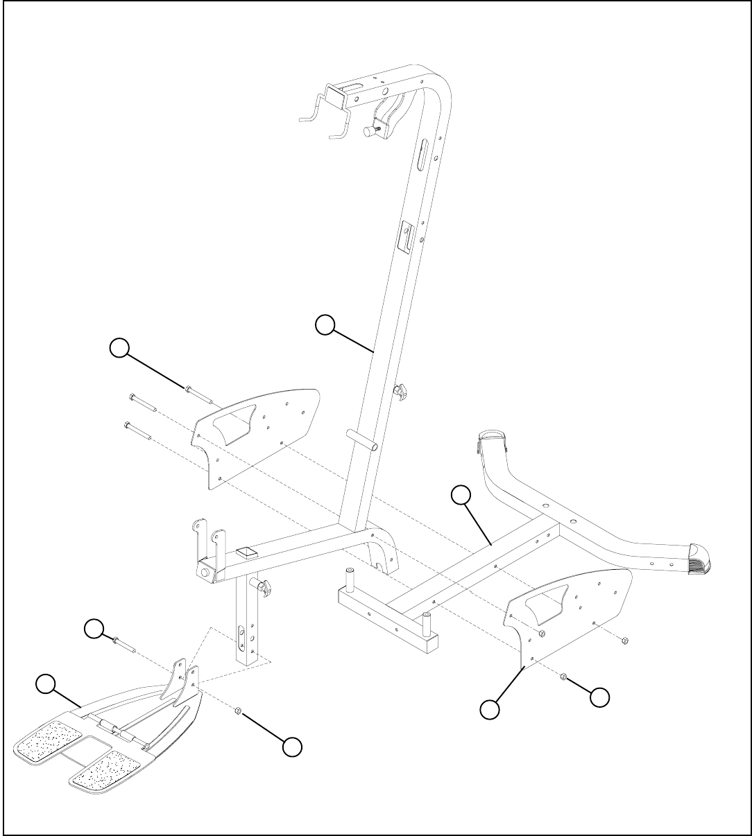 all bolts, nuts, washers, bearings, bushings, pulleys, thumbscrews, collars, cable retaining clips, adjustable pre-stretch slides, roller pad