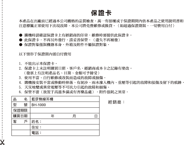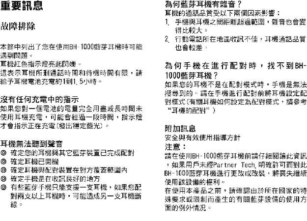Partner Tech BH-1000 BLUETOOTH HEADSET User Manual new
