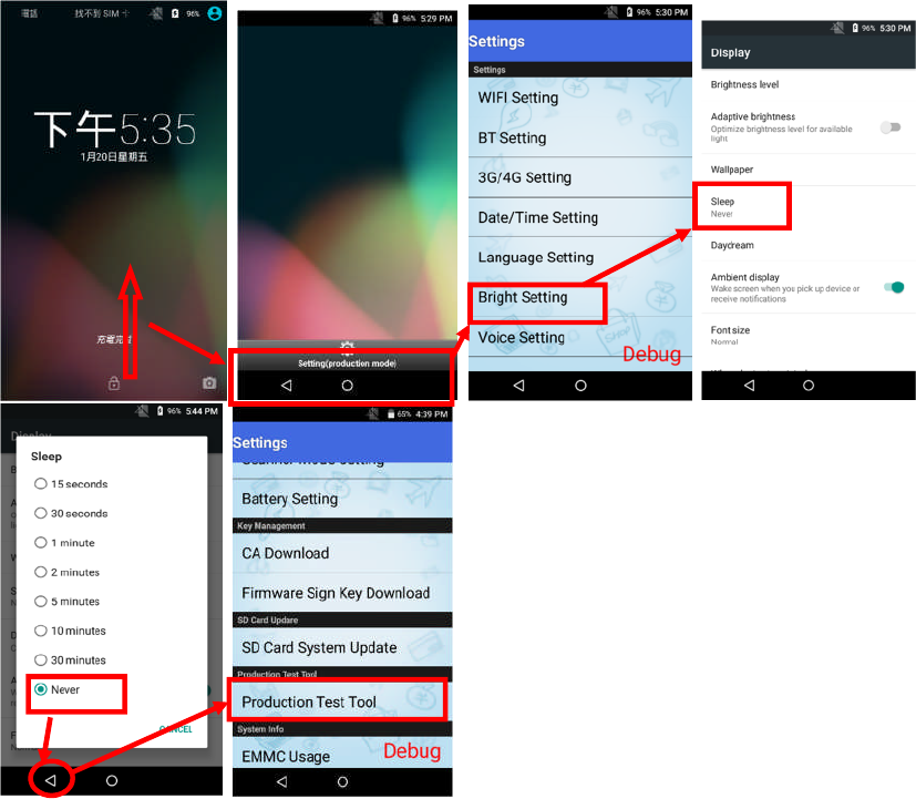 Plug Adapterslide up to unlock screenclick Setting (production mode)