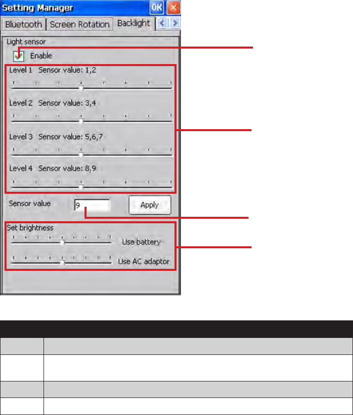 2 The light sensor has nine values. With this panel you can adjust your backlight levels