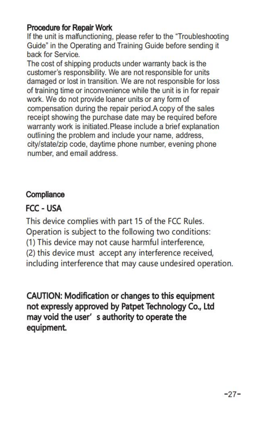 Shenzhen Patpet Technology Co., Ltd Remote Training Collar Users Manual