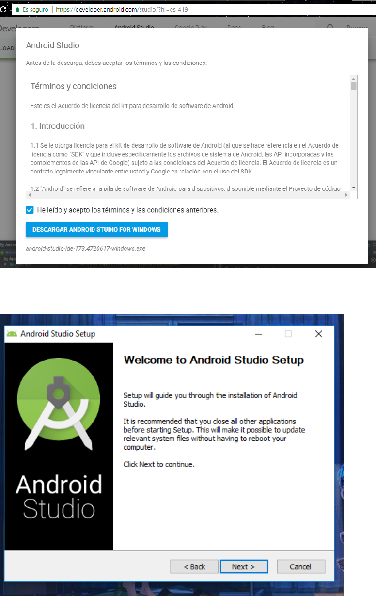 1. Nos dirigiremos a la página oficial de Android Studio para descargar el .exe