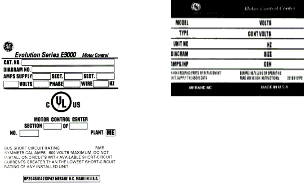 1. Equipment GE Evolution Series E9000 motor control center.