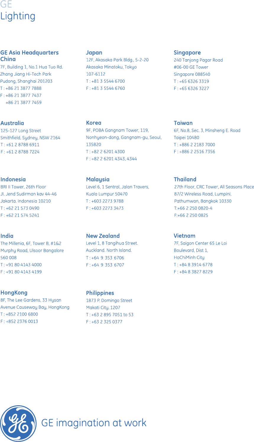Any update of data in this leaet will not be informed. Please contact GE Lighting for detailed information.