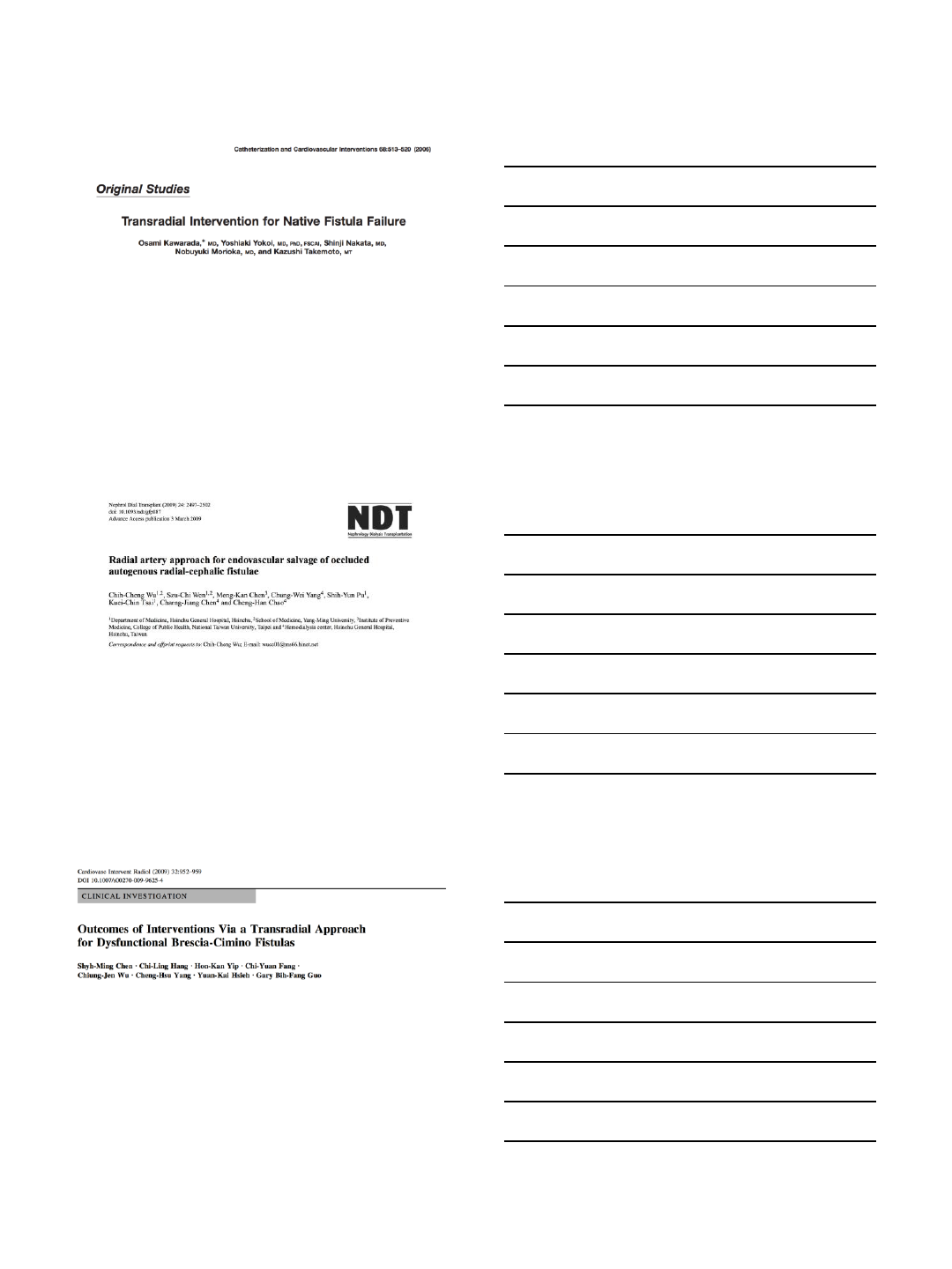 Cooper CJ, El-Shiekh RA, Cohen DJ, et al. Effect of transradial access on quality of life and cost of cardiac catheterization: A randomized comparison. American heart journal. 09/01 1999;138(3 Pt 1):7-7.
