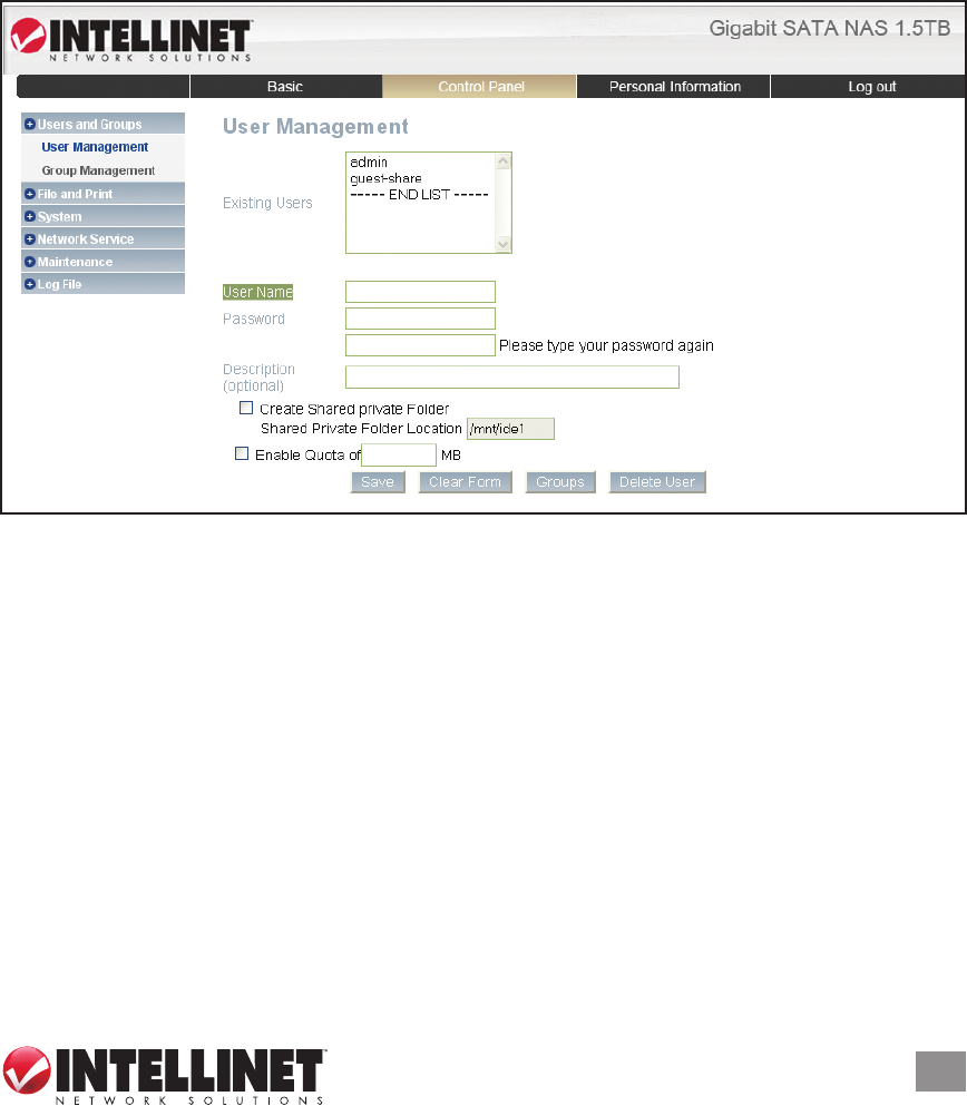 • Supports user groups and user accounts with quota management
